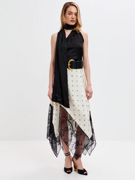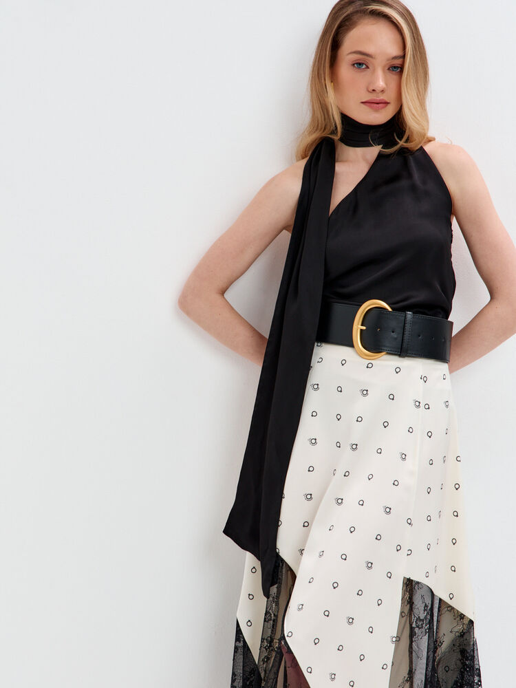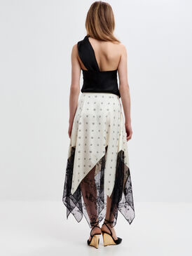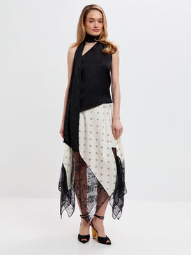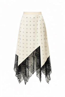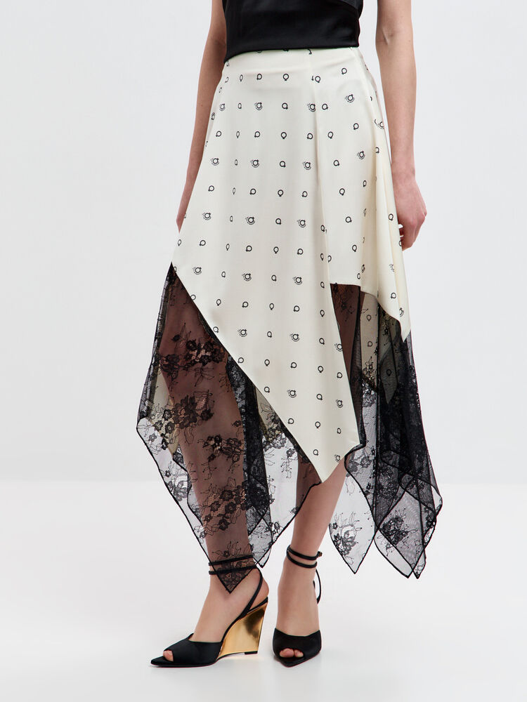 Юбка миди с клиньями сочетает в себе классику и современность. Молочный оттенок верха придаёт сдержанность, а кружевные чёрные клинья добавляют нотку кокетства. Асимметричный крой освежает традиционный силуэт. Подходит для создания элегантных образов с блузами и жакетами.