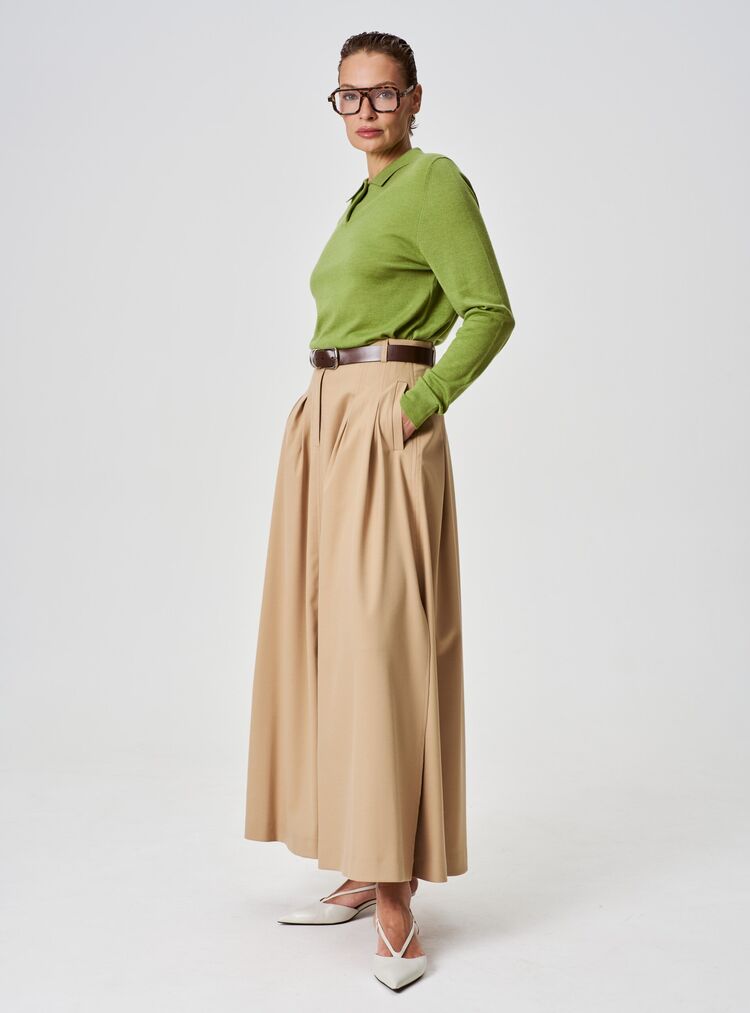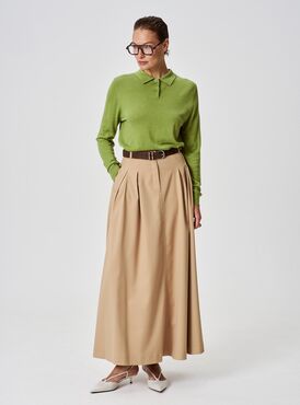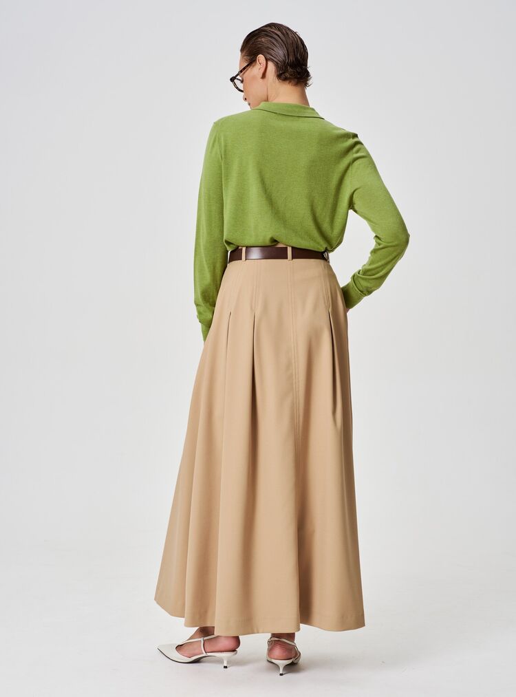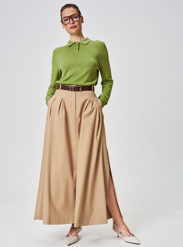 Бежевая юбка-сафари — изысканный элемент гардероба, который легко преобразит любой образ. Модель отличается продуманным кроем: высокая талия и выразительные складки создают лаконичный, но элегантный силуэт. Миди-длина делает юбку практичной — она органично впишется и в офисный дресс-код, и в расслабленный повседневный стиль. Материал приятен к телу, не стесняет движений, а нейтральный оттенок позволяет комбинировать юбку с самыми разными вещами.