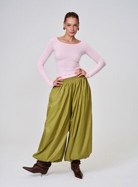 Стильные брюки‑алладины зеленого цвета сочетают восточный шарм и современный крой. Резинка на талии обеспечивает комфортную посадку без сдавливания, а манжеты с резинкой на низу брючин создают характерный силуэт и подчёркивают лёгкость модели. Ткань верха — полиэстер, подкладка — вискоза: сочетание гарантирует долговечность и приятные тактильные ощущения.