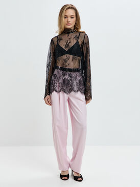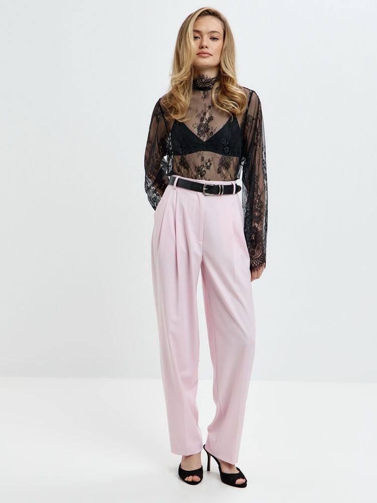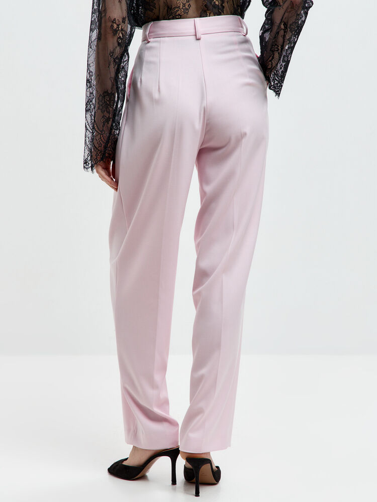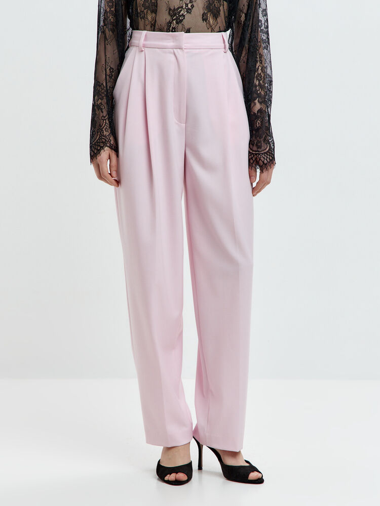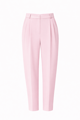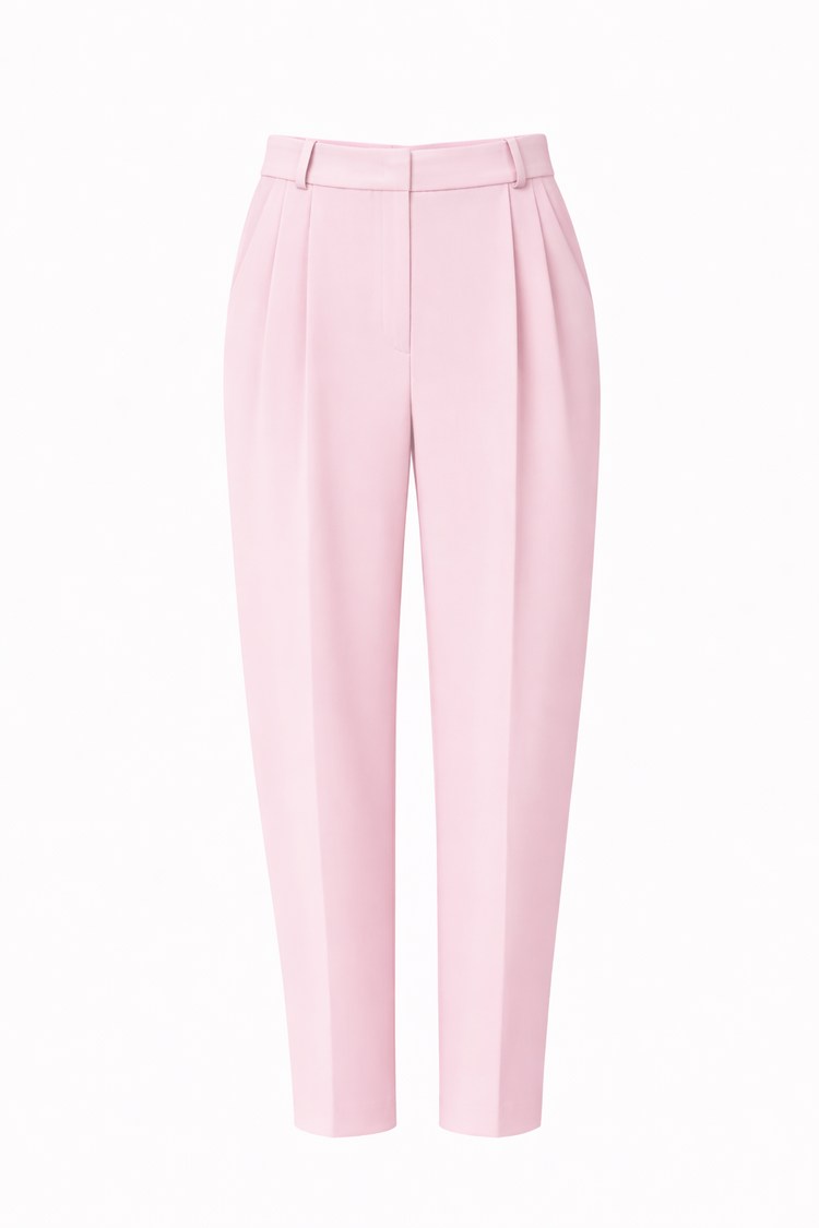 Розовые брюки-бананы с высокой посадкой — воплощение утончённой классики. Аккуратные складки по бокам и лаконичный крой создают изящный силуэт, а нежный оттенок придаёт образу романтичность.