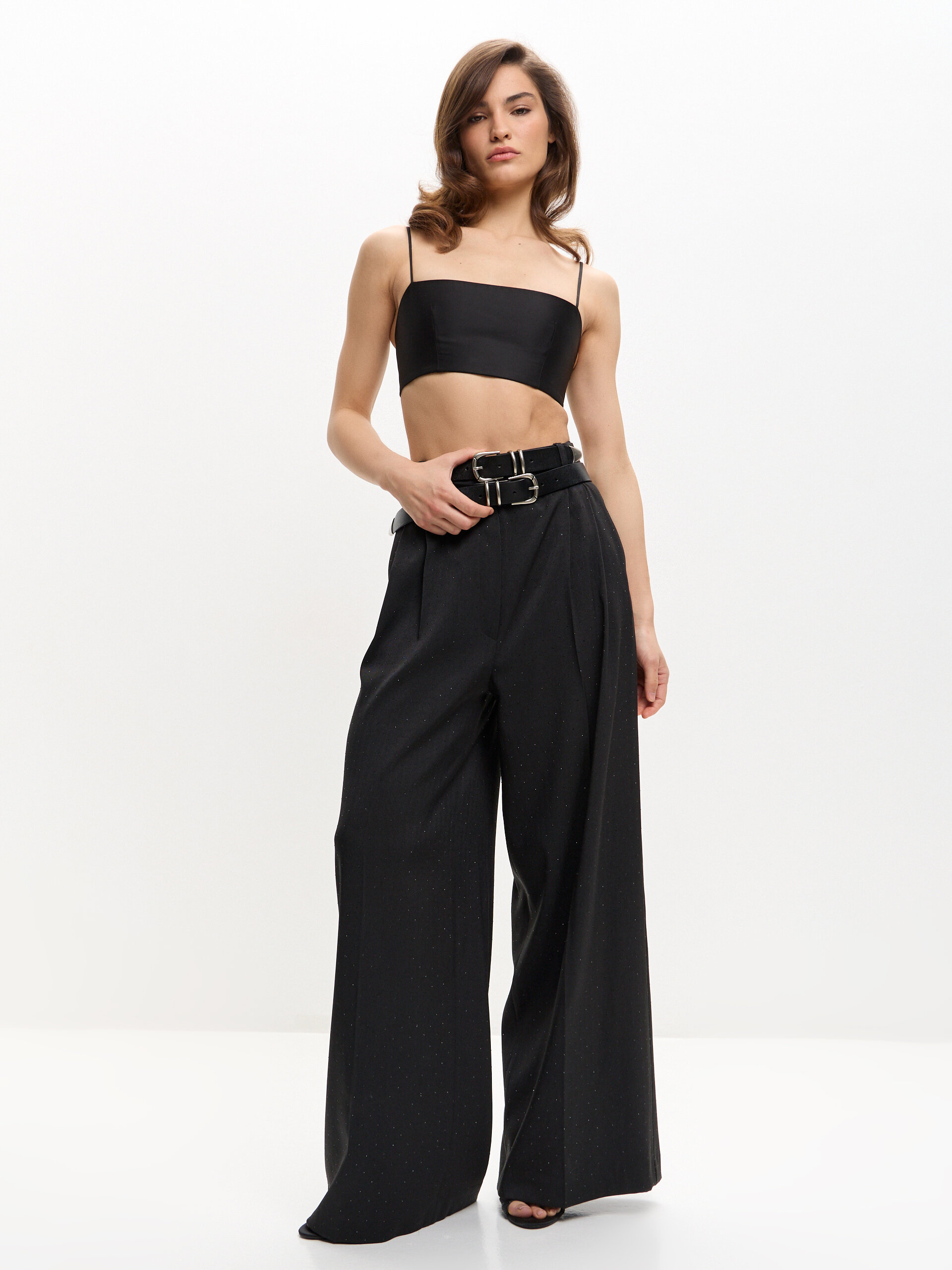 Брюки-палаццо в чёрном цвете выполнены из плотной костюмной ткани с вискозой в составе — она держит форму, красиво струится и создаёт аккуратный, вытянутый силуэт. Прямая посадка и шлёвки на талии обеспечивают идеальное прилегание и позволяют добавлять ремень для акцентного образа. Кристаллы, размещённые по всему изделию, мягко мерцают при движении и превращают классические брюки в настоящую вечернюю модель. Они легко сочетаются с жакетами, корсетами, атласными топами и становятся выразительной основой эффектного нарядного образа.