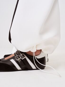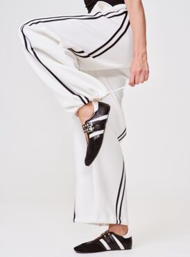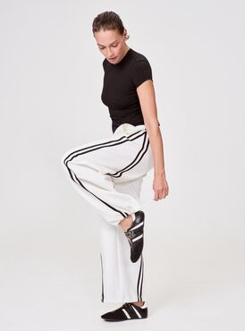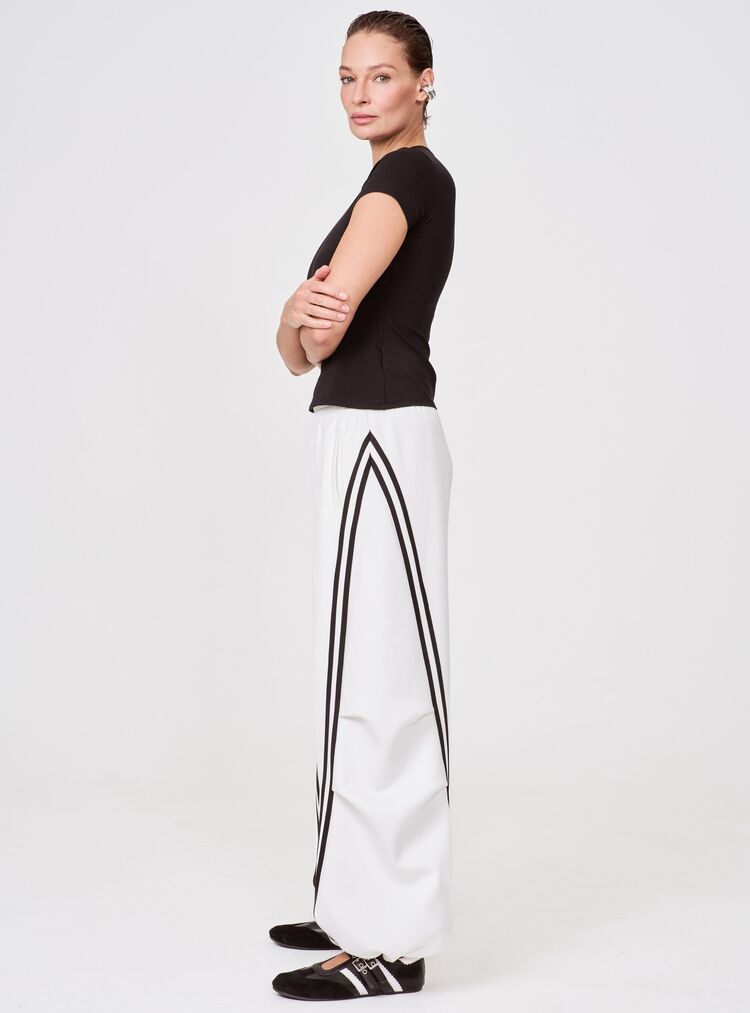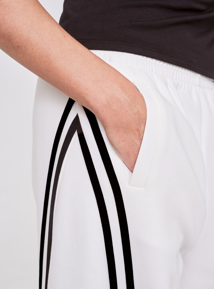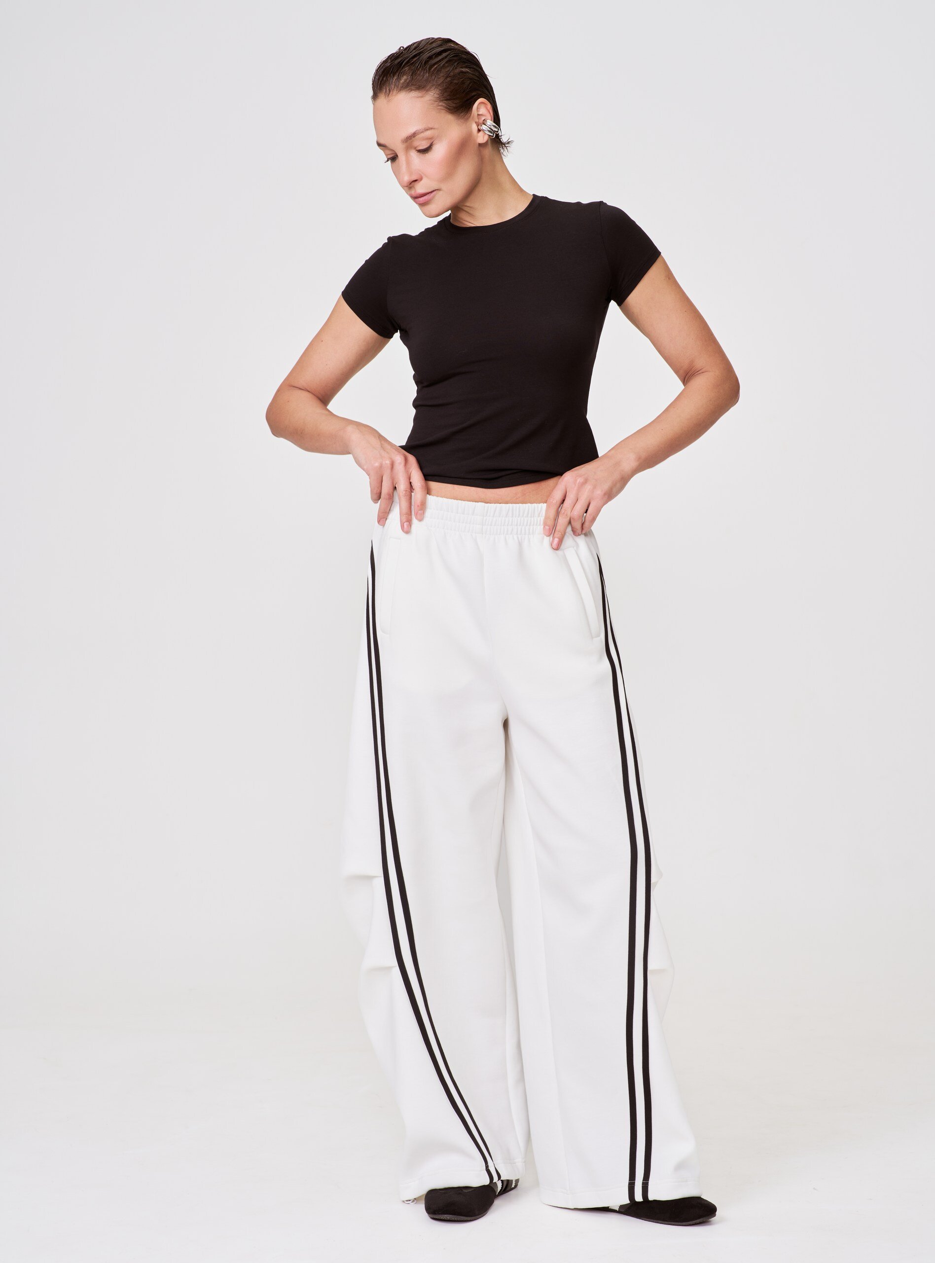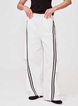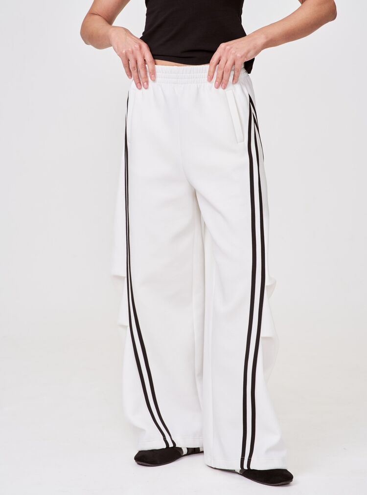 Белые спортивные брюки с О-силуэтом и стильными чёрными лампасами — must have для комфортного гардероба. Свободный крой не сковывает движения, идеально подходит для активного отдыха или расслабленных повседневных образов. Эластичный пояс обеспечивает удобную посадку, а лаконичный дизайн с контрастными лампасами и защипами придают модели модный акцент. Практичная модель легко сочетается с футболками, худи и кроссовками, позволяя создавать стильные кэжуал-луки.