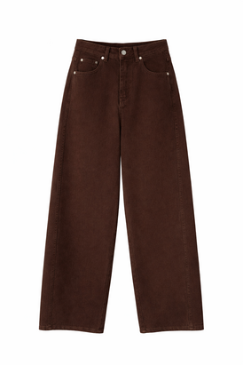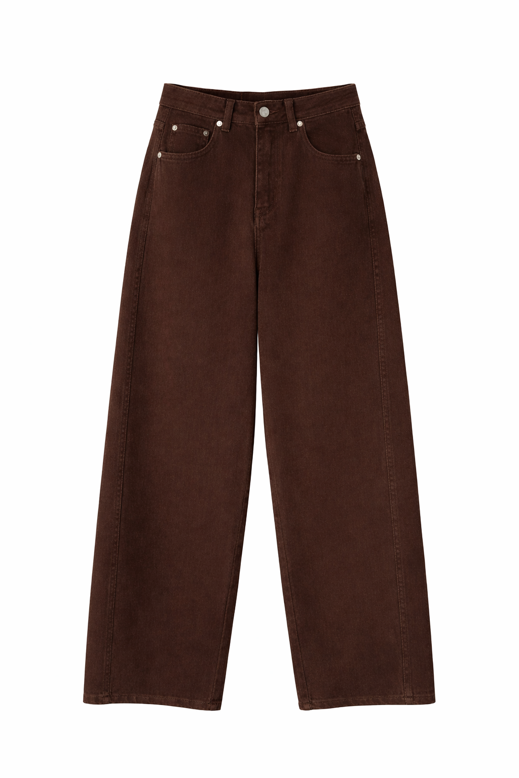Джинсы шоколадного цвета с прямым кроем — воплощение лаконичной элегантности. Аккуратная отстрочка в тон создаёт непрерывную вертикальную линию, визуально вытягивая силуэт и придавая образу стройность.