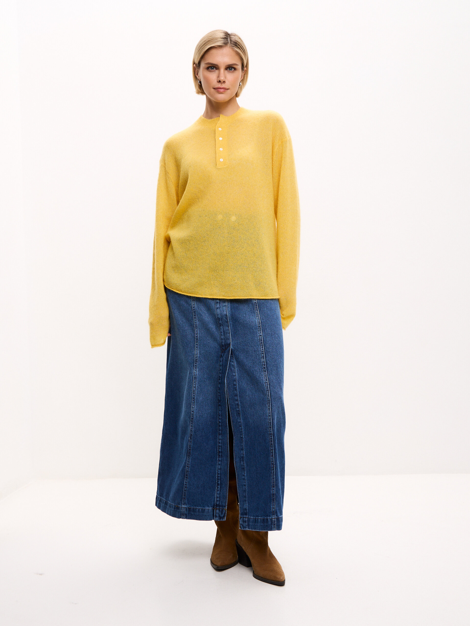 Стильный джемпер в желтом цвете с акцентными пуговицами на горловине и необработанными краями на рукавах и по низу. Лёгкий мохеровый пушок создаёт мягкий объём и уют. Эта модель добавляет образу романтичности и придаёт современный характер благодаря нестандартным деталям.
