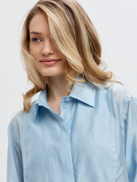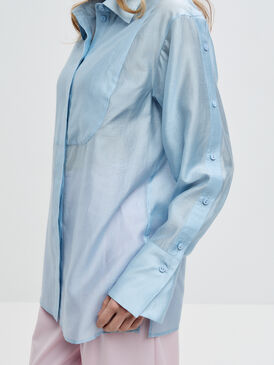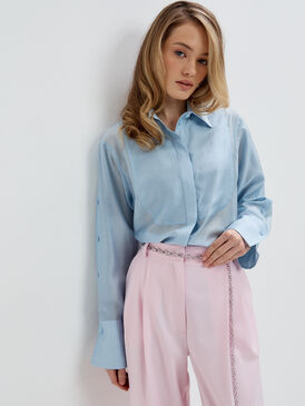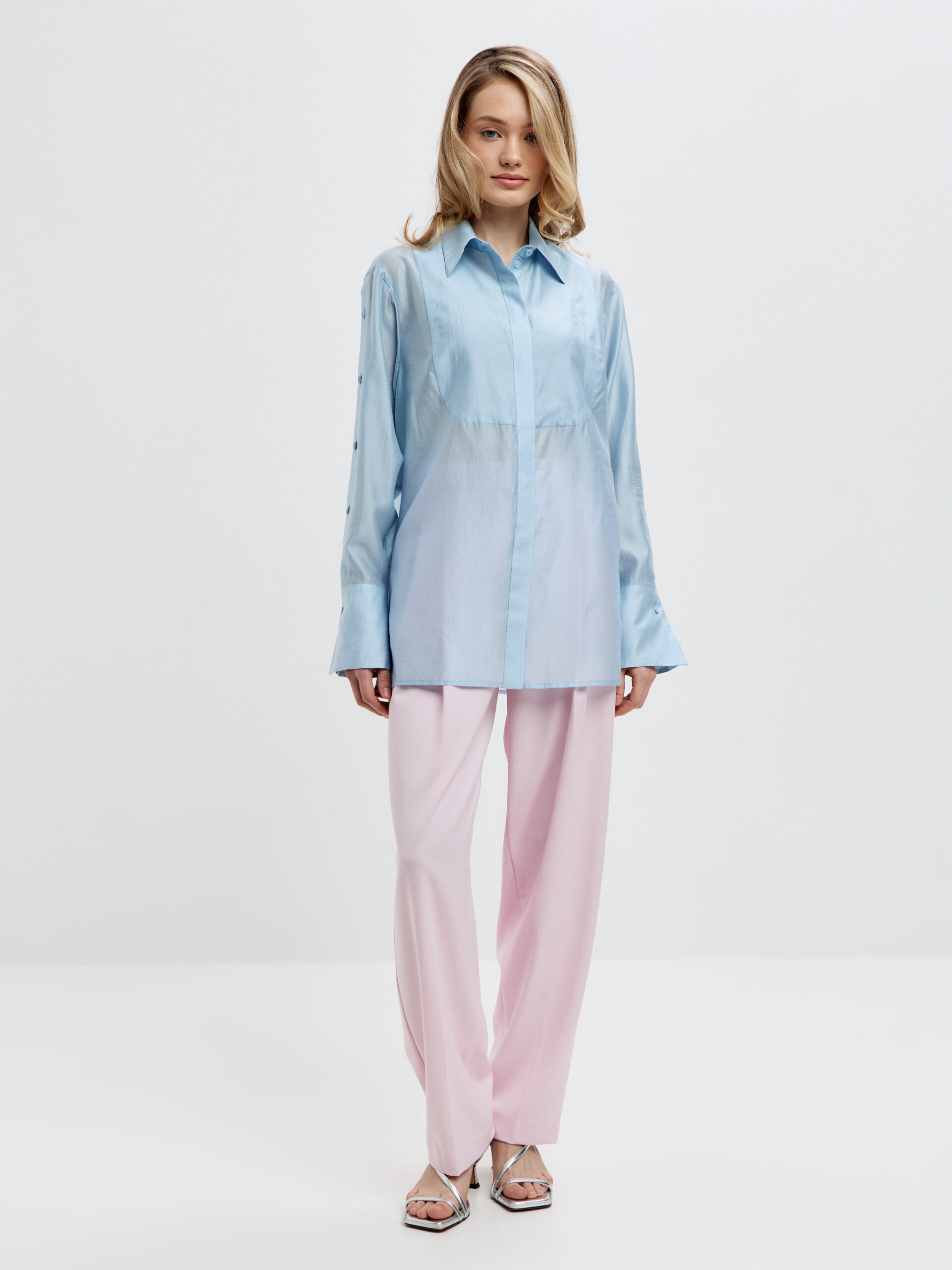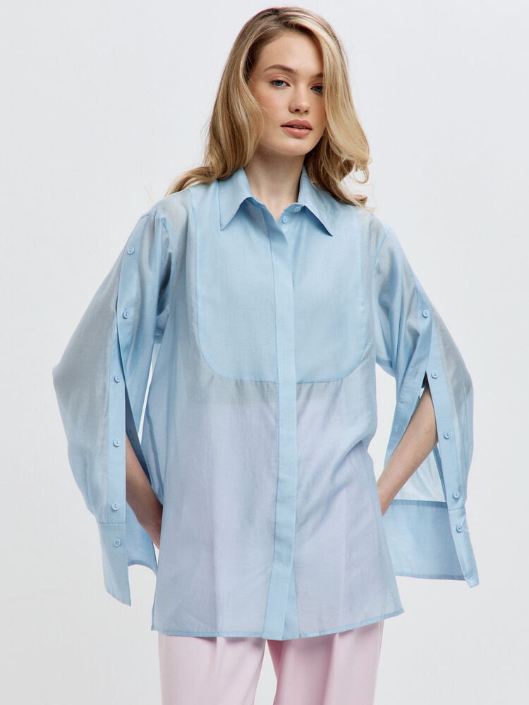 Голубая блуза с выразительными рукавами — стильный акцент для неповторимого образа. Пуговицы вдоль рукава позволяют менять настроение: от сдержанного до женственного (можно расстегнуть до плеча).