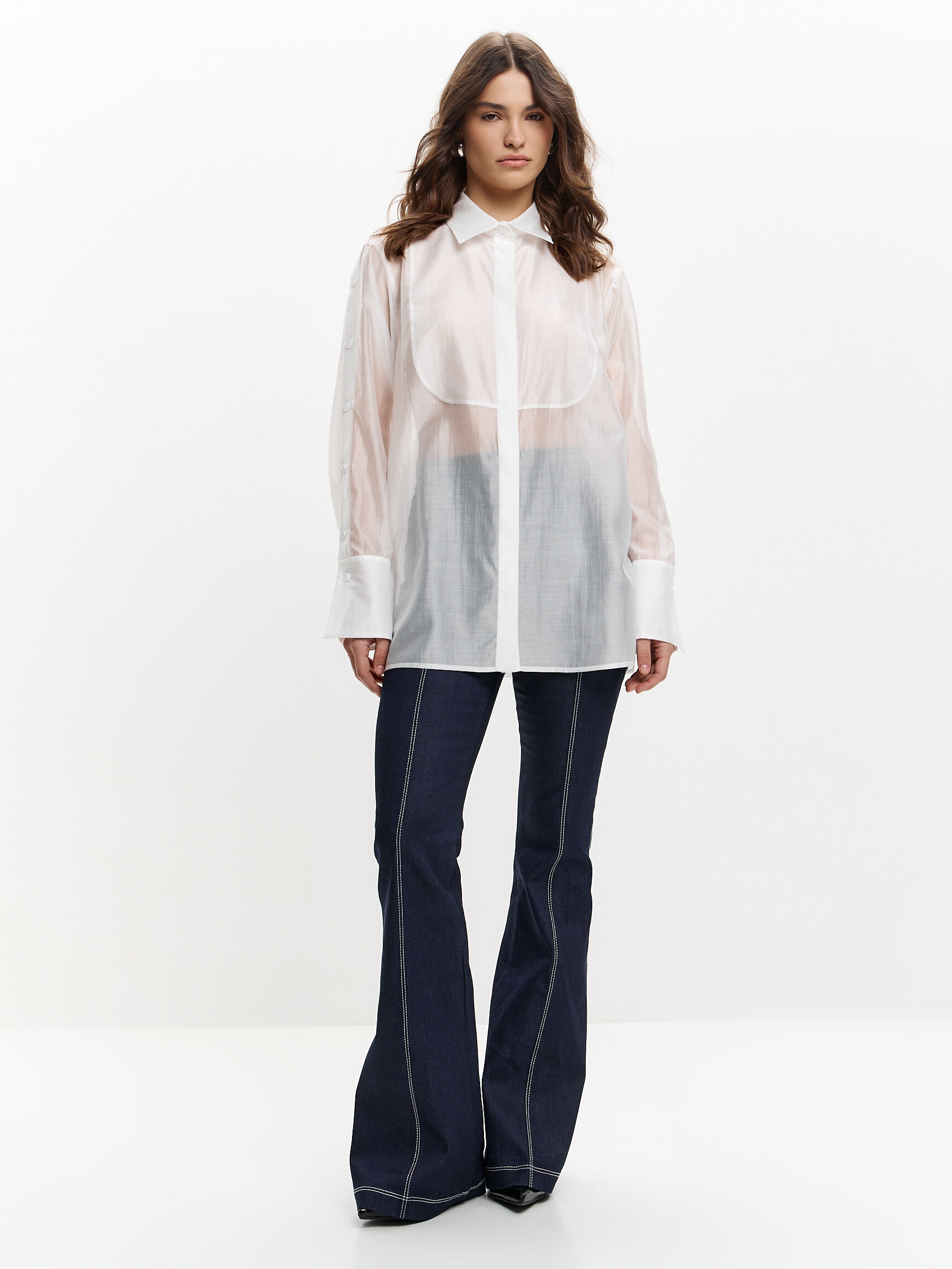 Молочная блуза с акцентными рукавами — та самая деталь, которая делает образ «не как у всех». Пуговицы по всей длине рукава можно полностью расстегнуть до плеча, меняя настроение образа: от сдержанного до смело-женственного. Свободный крой мягко ложится по фигуре, а ткань с вискозой приятно ощущается на коже и красиво драпируется. Идеальна для стилизации — с джинсами, костюмными брюками или юбкой, когда хочется выглядеть расслабленно, но продуманно.