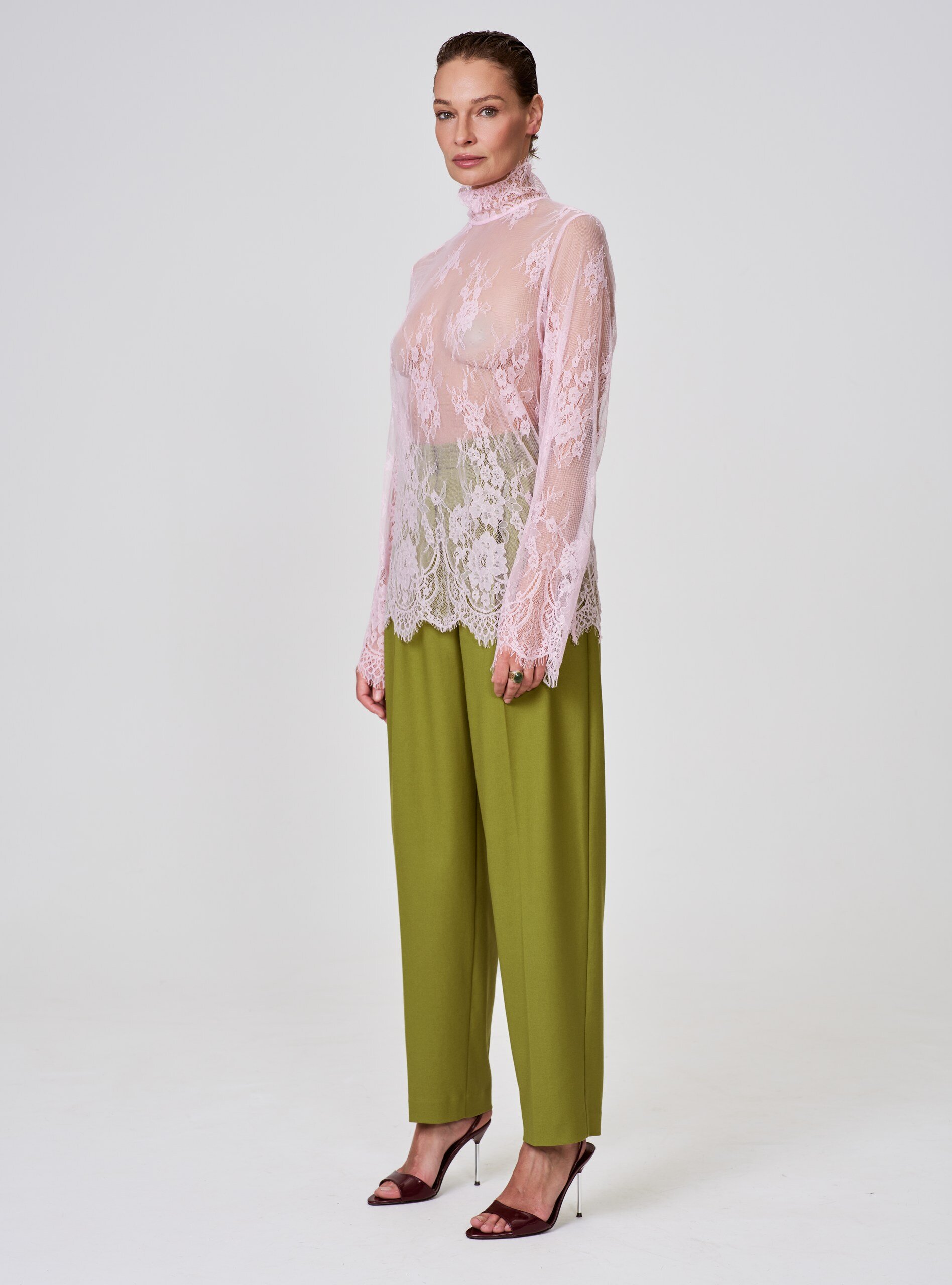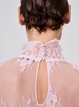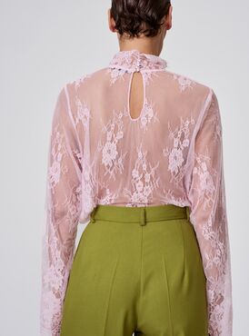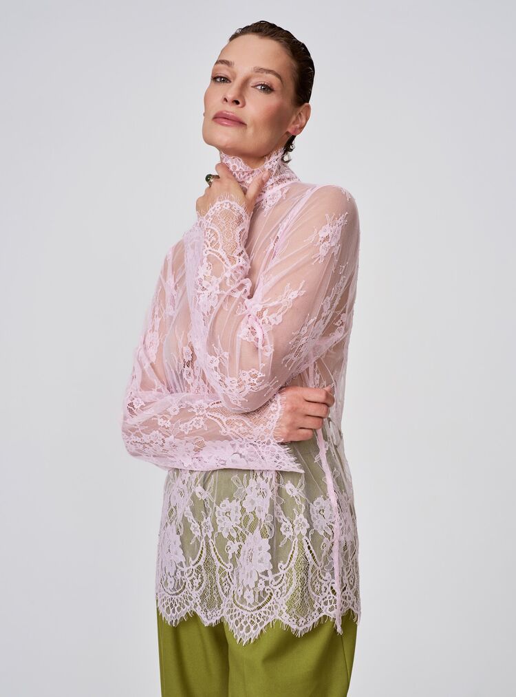 Кружевная блуза с высоким воротом и длинными рукавами — олицетворение утончённой женственности. Прозрачная ткань с изысканным цветочным узором создаёт эффект воздушности и лёгкости. Строгий крой гармонично сочетается с кокетливой прозрачностью материала, придавая образу романтическую изысканность.