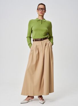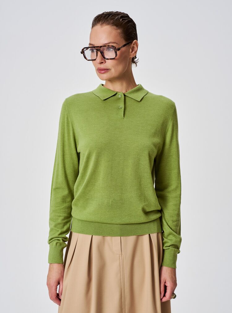 Трикотажное поло с длинными рукавами насыщенного зелёного оттенка — незаменимая вещь в базовом гардеробе. Классический крой с воротником и двумя пуговицами сочетает элегантность и комфорт, а мягкий материал приятно облегает тело, не сковывая движений. Модель подойдёт как для повседневных образов, так и для более формальных случаев — достаточно дополнить её брюками или джинсами.
