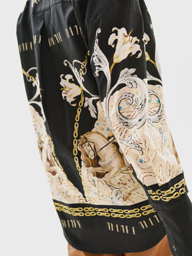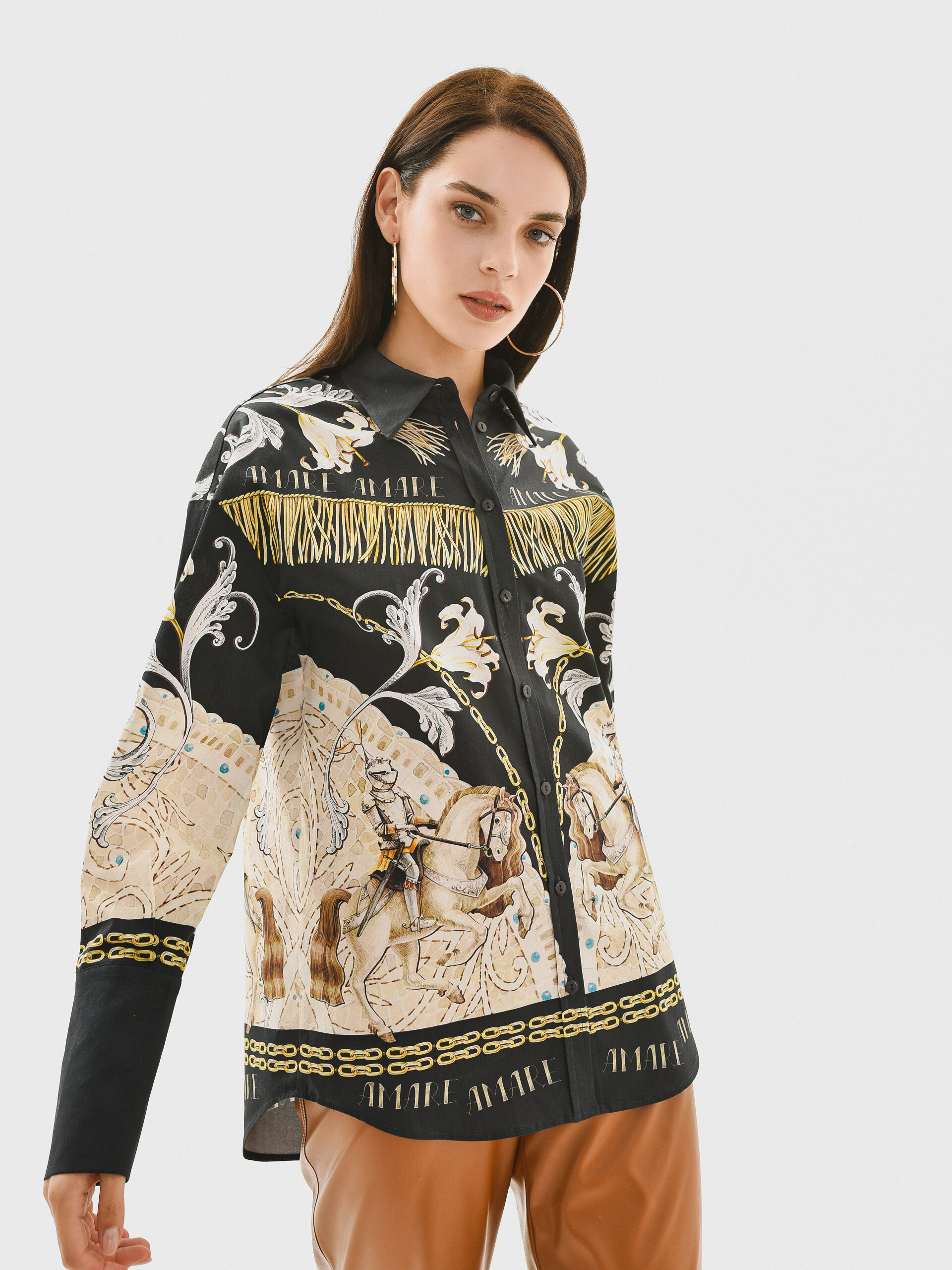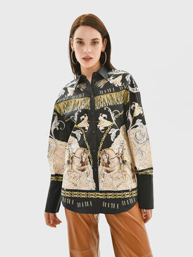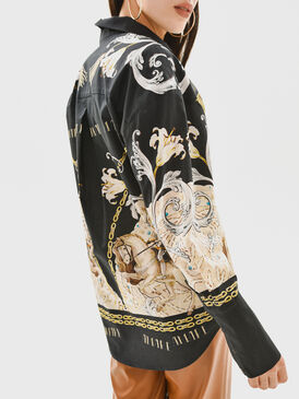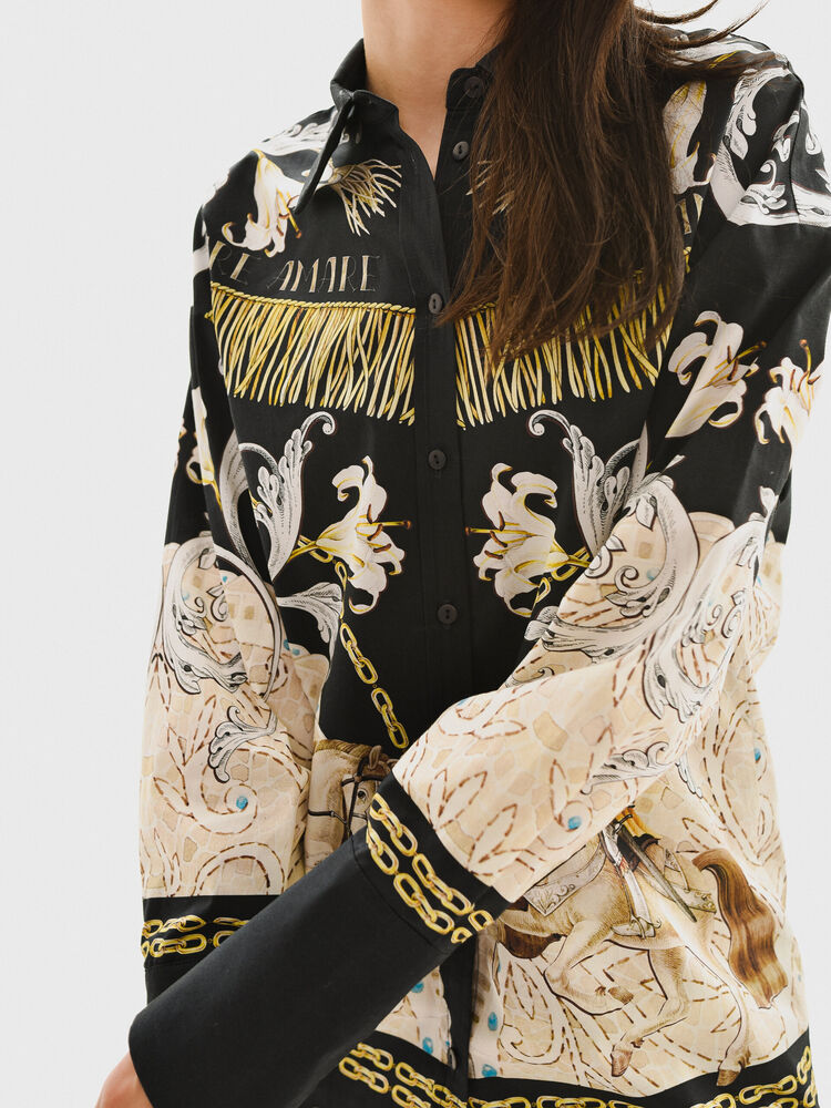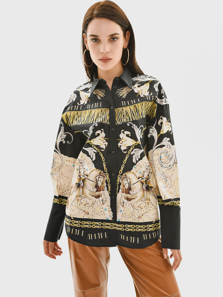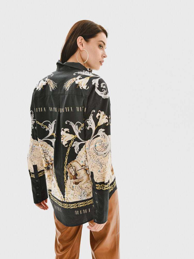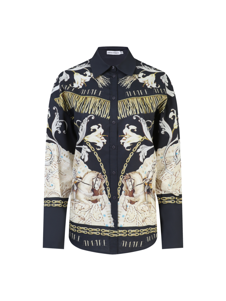Свободная блуза темно-синего цвета с уникальным авторским принтом