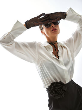 Молочная блуза из нежной вискозы. Имеет красивые и элегатные удлинённые манжеты.