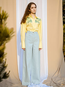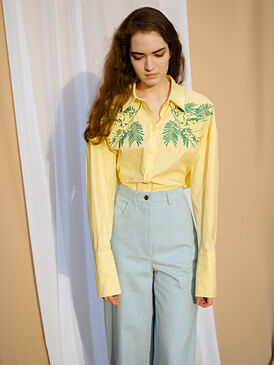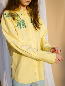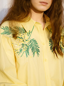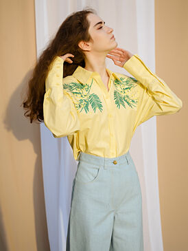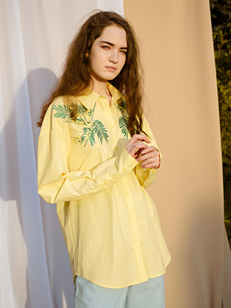 Удлиненная блуза с дизайнерской вышивкой "мимозы" просто не оставит Вас без внимания. Её можно надеть с джинсами, классическим костюмом, сделав образ не таким строгим, или завязать поверх платья-комбинации.