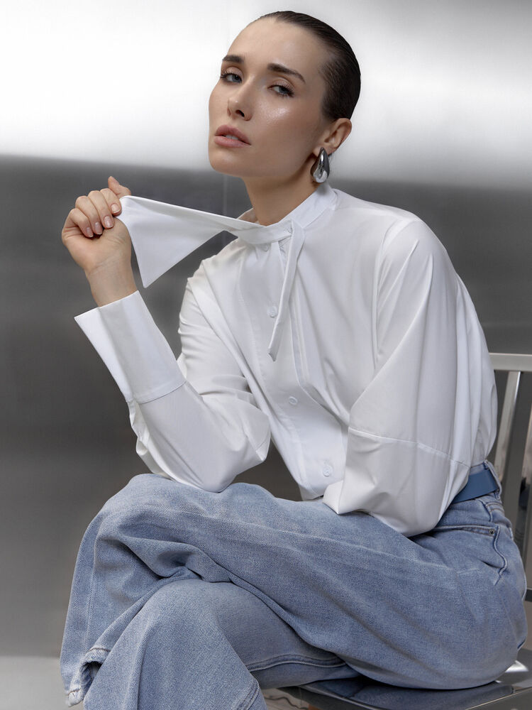 Блуза прямого кроя, полной длины. Благодаря дизайнерскому воротнику и оригинальному крою рукава модель выглядит изысканно