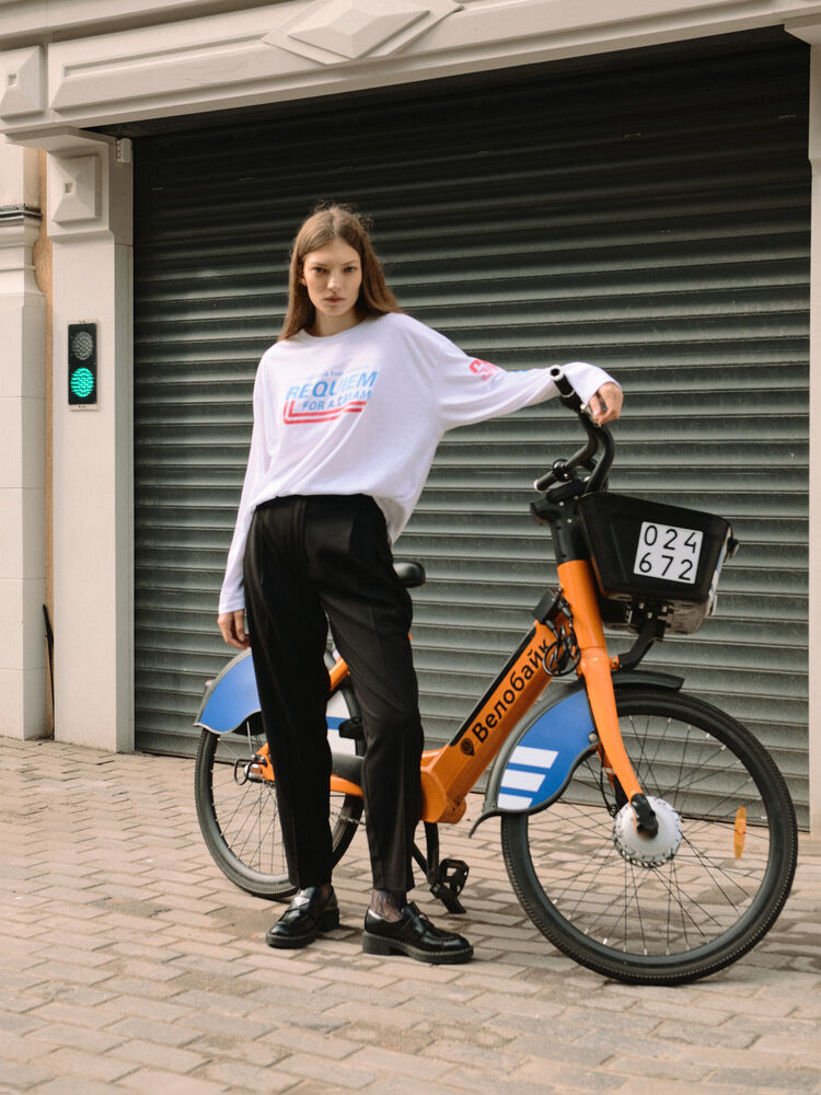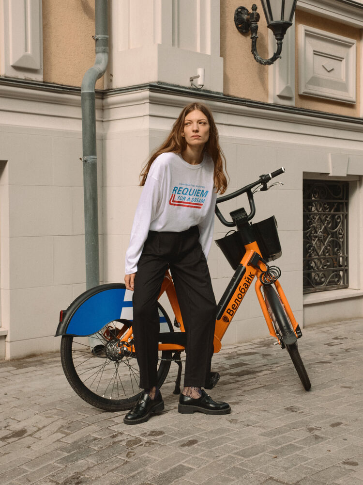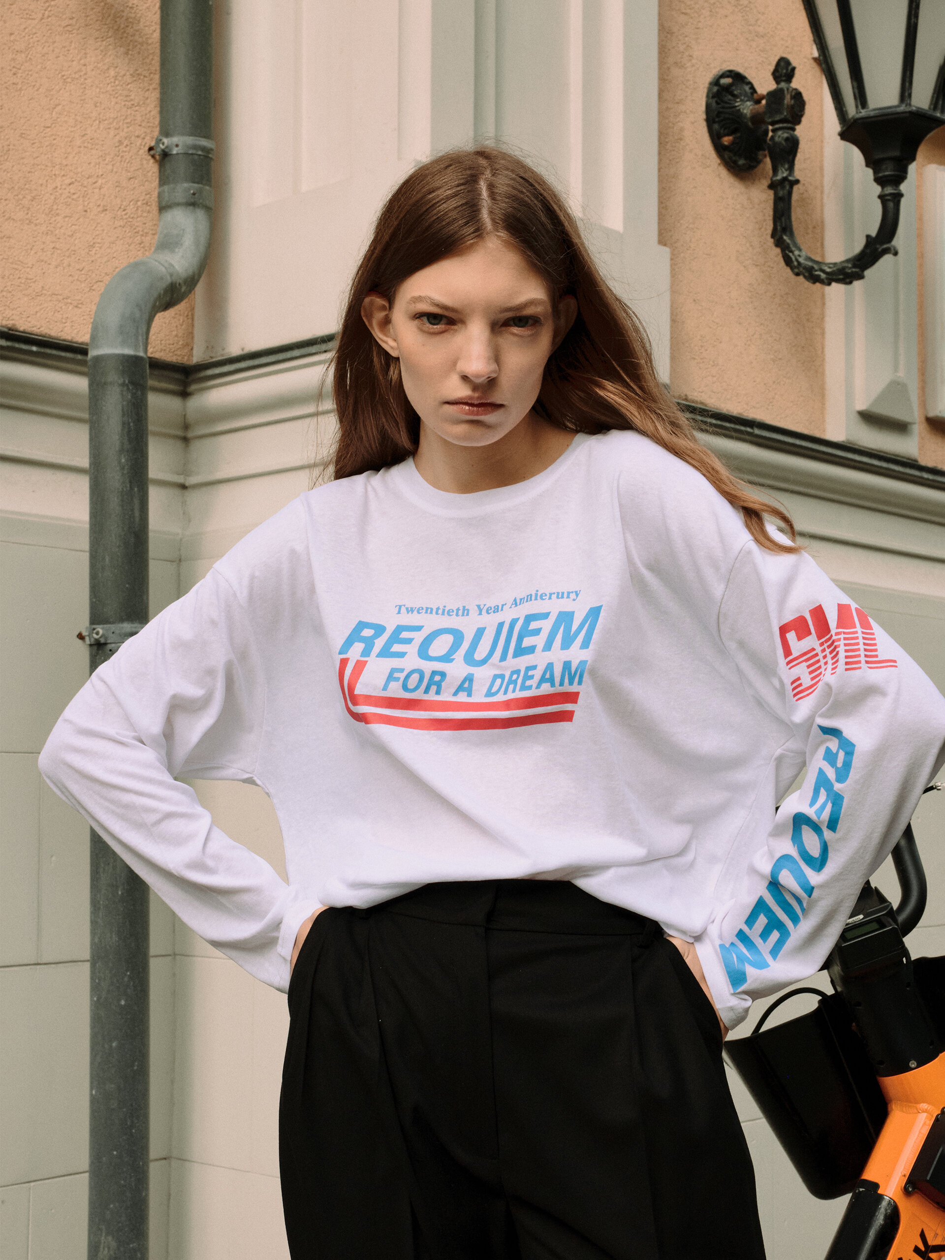 Лонгслив белого цвета с ярким принтом-надписью "Реквием по мечте" на груди. Крой свободный, со спущенной линией плеча.