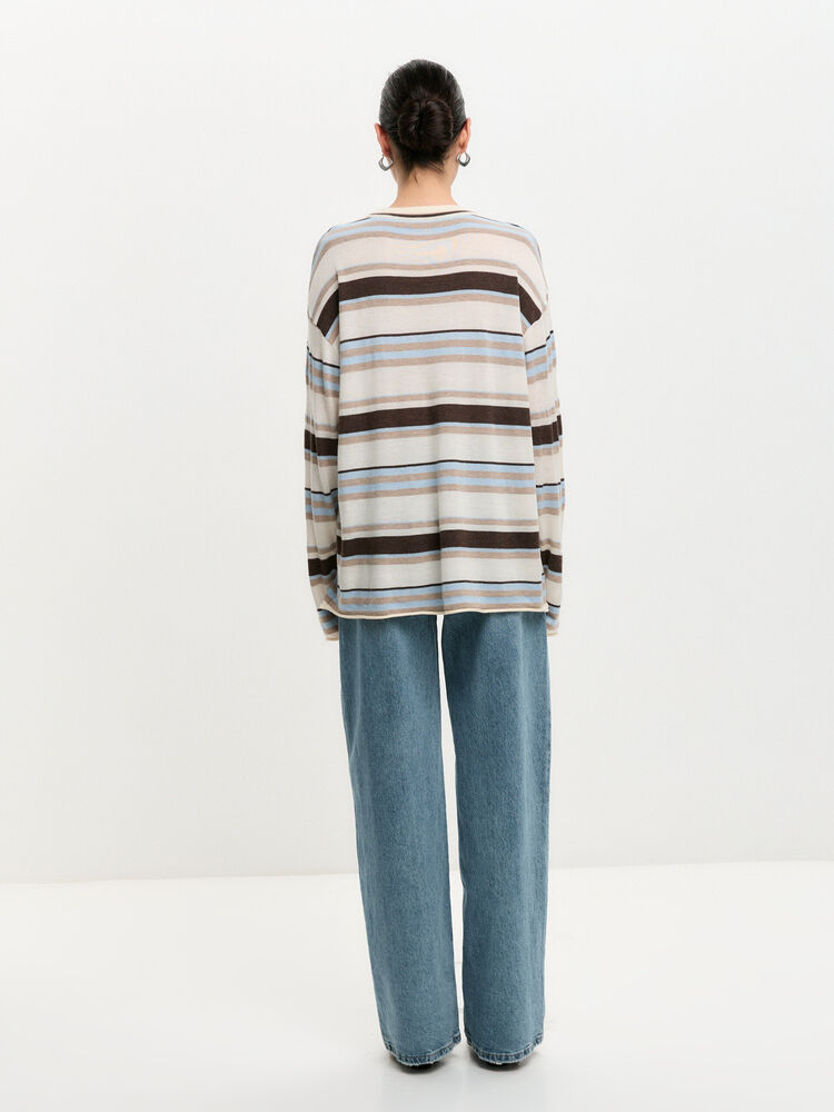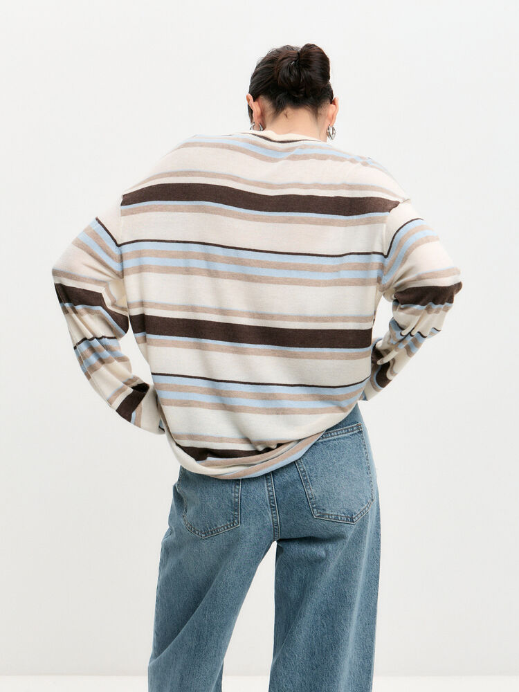Джемпер прямого кроя, полной длины, со спущенным плечом из плотной вязаной ткани в молочном цвете.