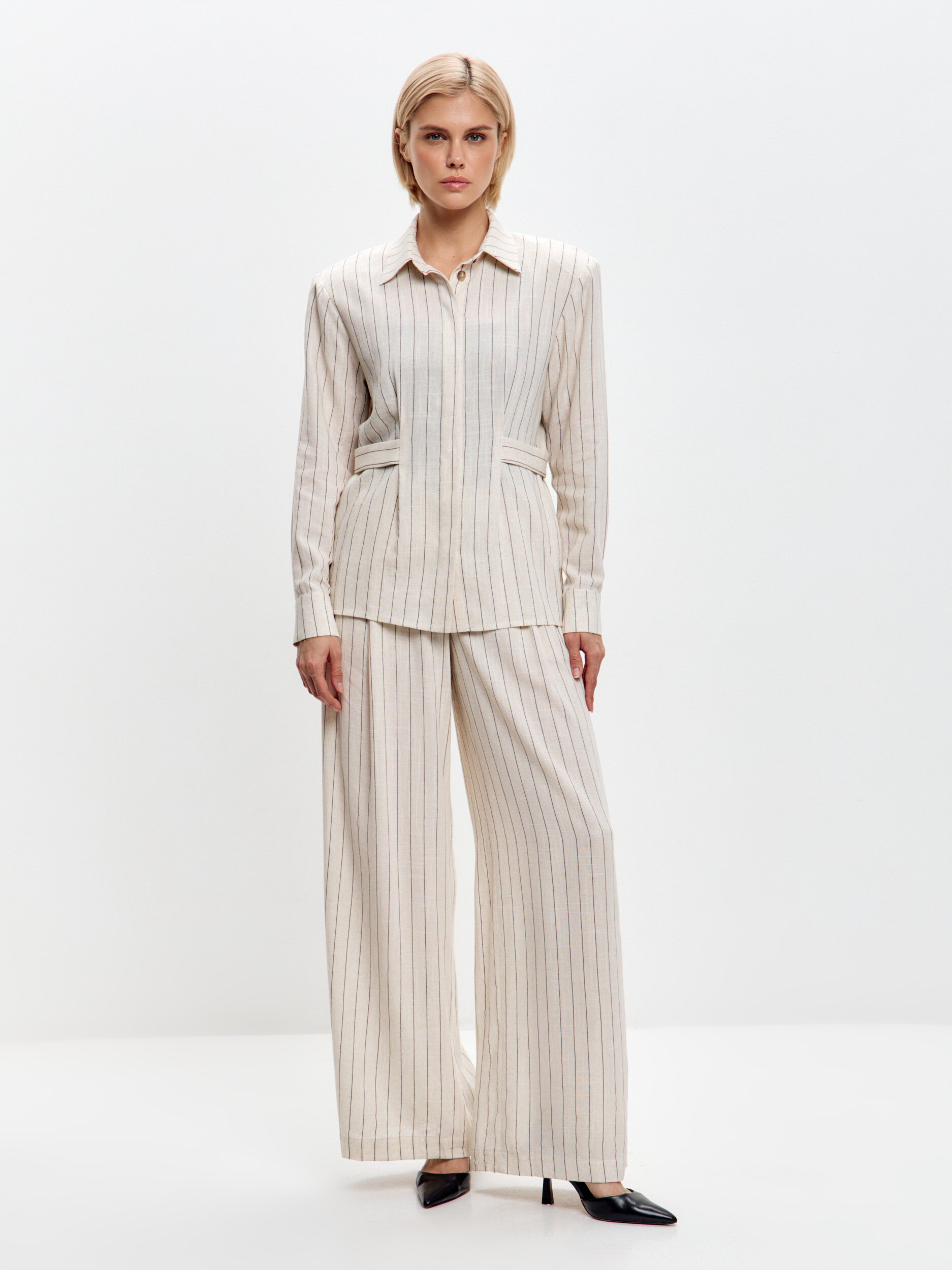 Молочная рубашка в полоску из льна — светлая и свежая альтернатива классике. Прямой крой, съёмные подплечники и регулируемые паты на талии делают модель универсальной и адаптивной. Тонкая полоска вытягивает силуэт, а фактура льна подчёркивает премиальность образа.