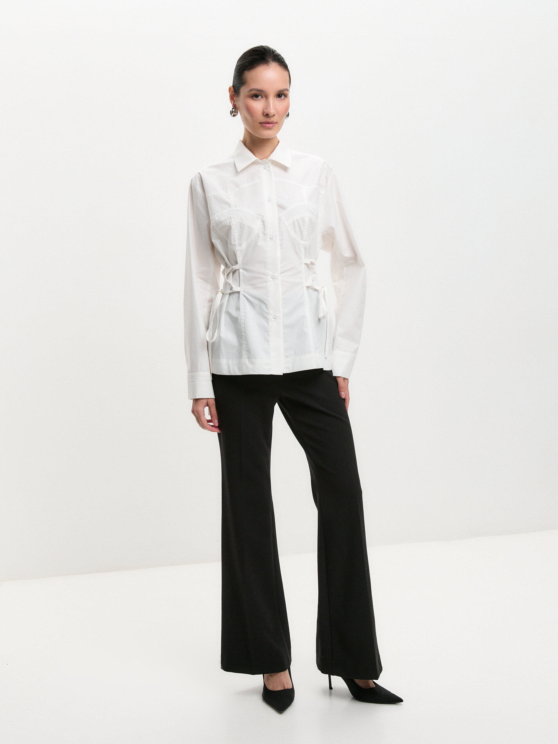 Рубашка в нежном молочном оттенке выполнена из лёгкой и приятной к телу ткани. Декоративная окантовка по типу корсета подчёркивает талию, а боковые шнурки позволяют регулировать посадку, создавая выразительный женственный силуэт. Стильная альтернатива классической белой рубашке — уместна и в офисе, и в повседневных образах.