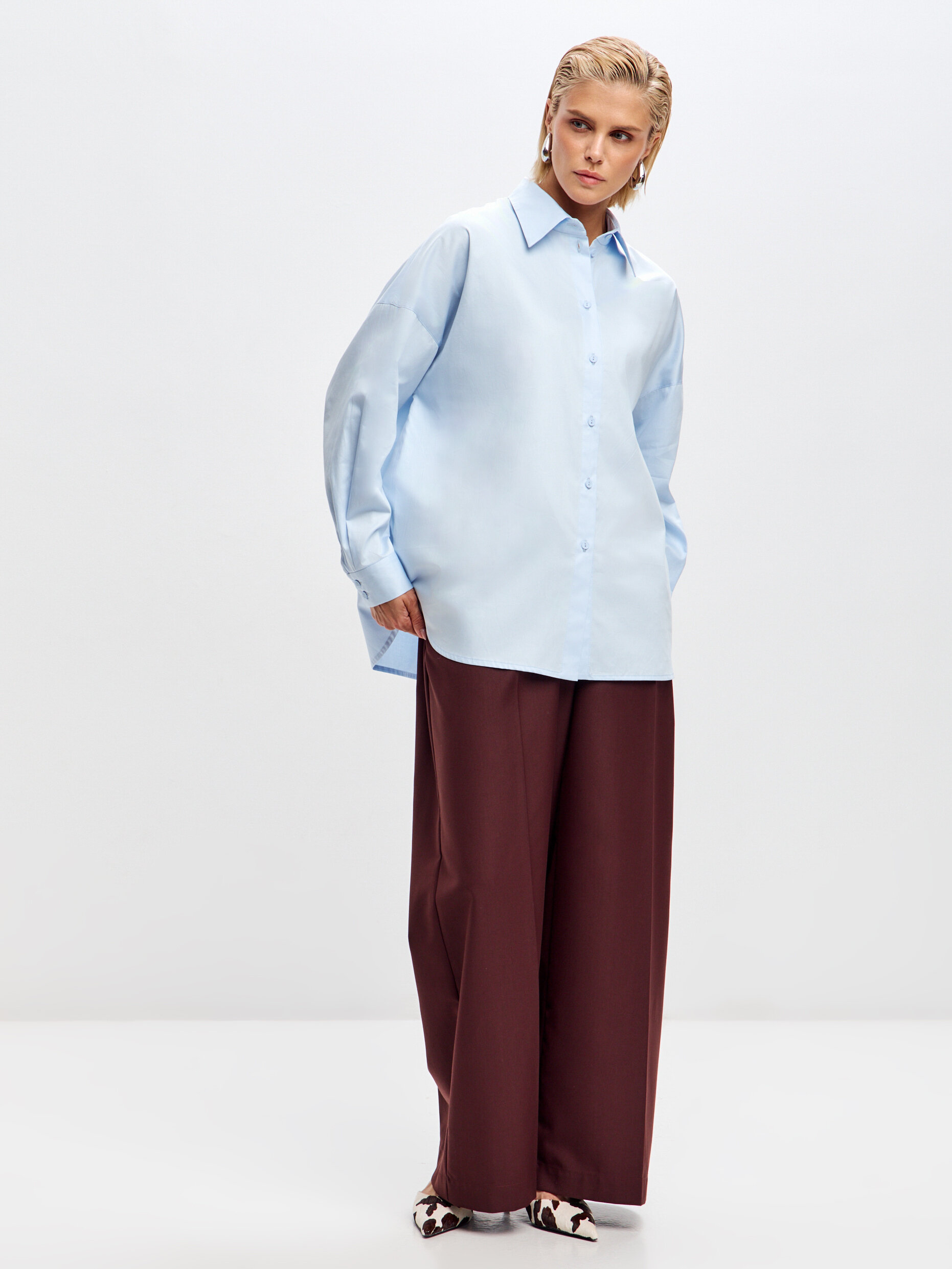 Рубашка выполнена из хлопка с добавлением полиэстера — материал приятный к телу, хорошо пропускает воздух и меньше мнётся в носке. Свободный крой с заниженной линией плеча создаёт расслабленный, актуальный силуэт и позволяет легко вписывать модель как в офисные, так и в повседневные образы. Классический воротник и аккуратная застёжка на пуговицы добавляют образу собранности, а мягкий голубой оттенок освежает и легко сочетается с базовым гардеробом. Универсальная модель для многослойных образов и самостоятельной носки.