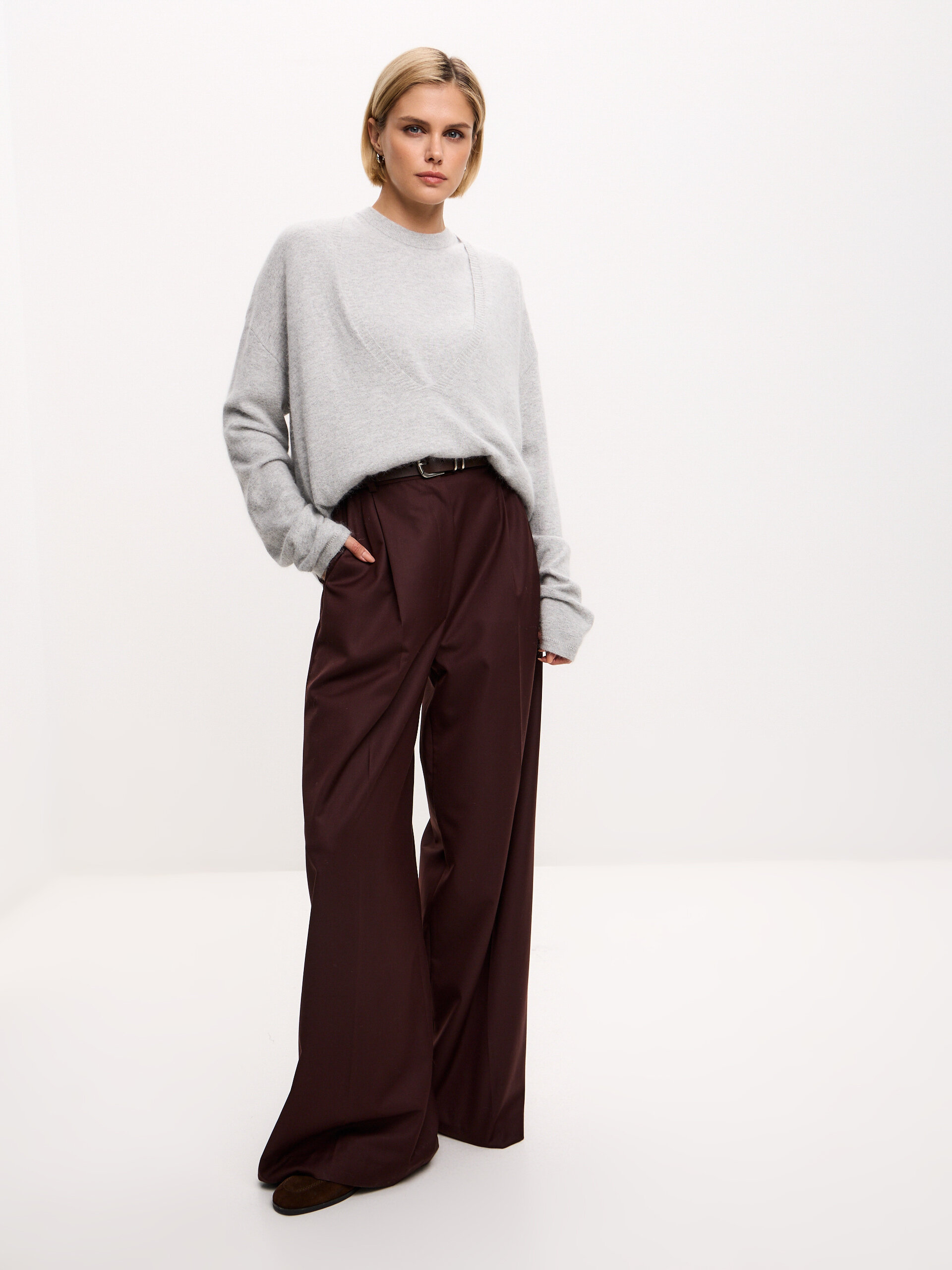 Элегантный джемпер с глубоким V-образным вырезом в универсальном сером оттенке. Лёгкая текстура и благородная простота делают его идеальной базой для многослойности. Сочетается с брюками-палаццо, юбками и жакетами, создавая сдержанный и стильный образ.