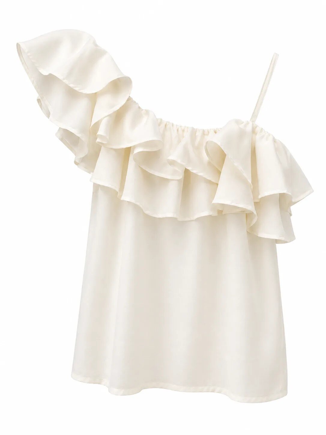 Романтичный топ из вискозы с воланами и асимметричным кроем. Можно носить как на одно плечо, так и открыть оба, спустив блузу с плеч.