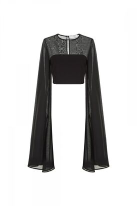 Топ в чёрном цвете с длинными рукавами — изысканная и чувственная модель, в которой сочетаются плотный трикотажный джерси и тончайшая вискозная вуаль. Верх и рукава выполнены из полупрозрачной ткани, создающей воздушное настроение, а плотная основа придаёт образу графичность и уверенность. Прилегающий силуэт подчёркивает фигуру, а расклешённые рукава с разрезами ниже локтя добавляют драмы и изящества. Застёжка на пуговицу сзади завершает образ аккуратной деталью.