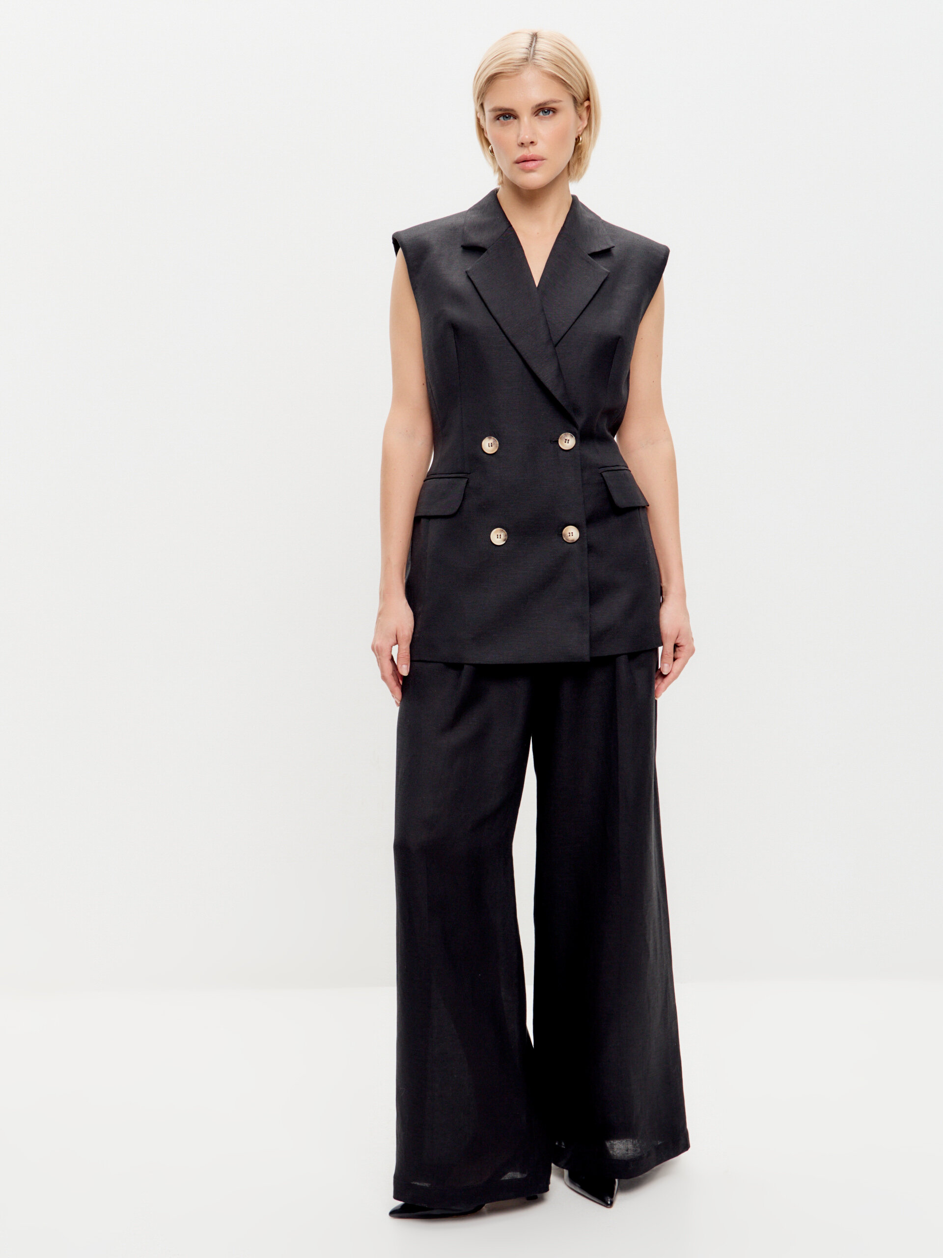 Чёрный жилет из льна — элегантная модель прямого силуэта с акцентными лацканами, двубортной застёжкой и V-образным вырезом. Ткань из натурального льна делает жилет комфортным даже в жару, а строгий крой придаёт образу архитектурность. Идеален как для делового гардероба, так и для многослойных летних образов.