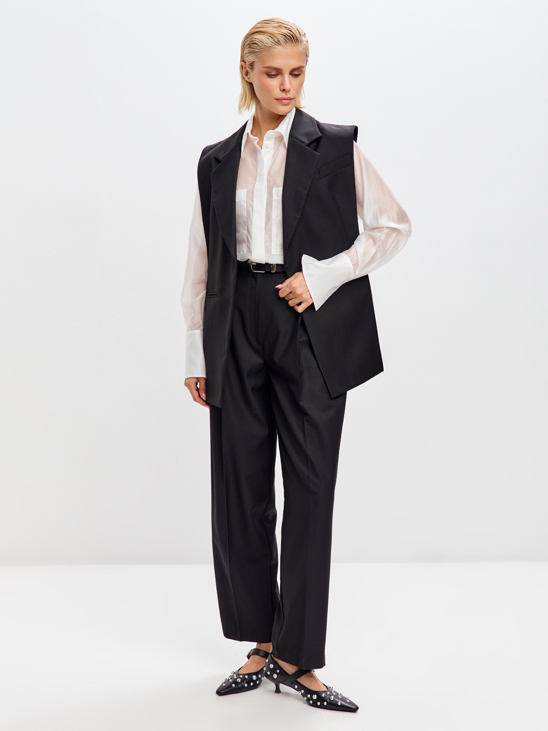 Элегантный чёрный жилет-накидка — смелое и стильное решение для современного гардероба. В отличие от классических моделей, этот жилет лишён перемычек, что превращает его в эффектную деталь, напоминающую плащ. Прямой крой подчёркивает лаконичность и строгость образа, а свободный силуэт дарит комфорт и лёгкость движений. Лаконичные лацканы и аккуратный карман добавляют жилету делового шарма, сохраняя при этом нотку авангарда. Такая модель идеально подойдёт для создания многослойных образов: сочетайте её с рубашками, водолазками или топами, чтобы добавить аутфиту глубины и динамики. Жилет-накидка станет изюминкой как делового, так и креативного лука, подчёркивая индивидуальность и чувство стиля.