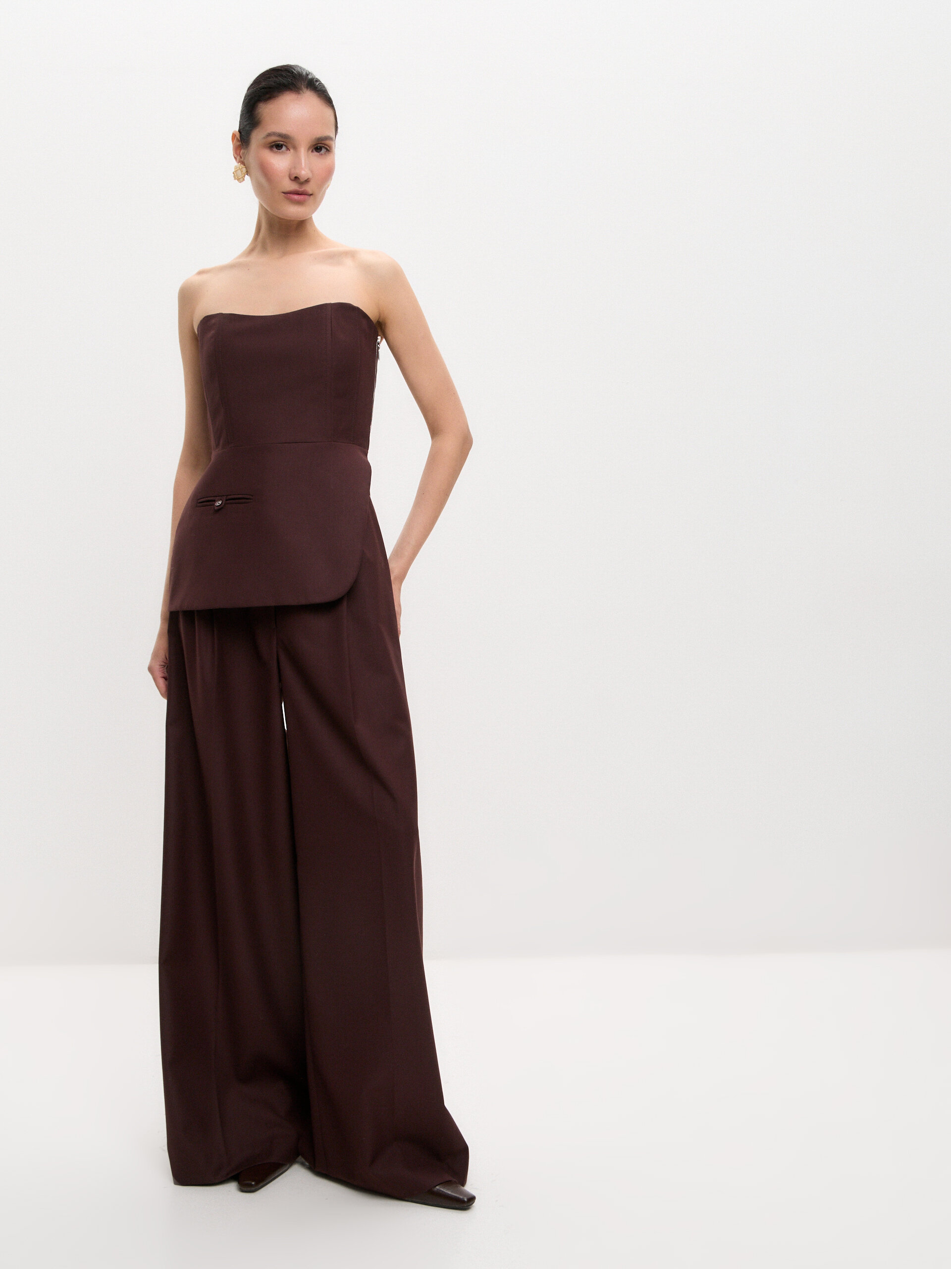 Корсет в шоколадном цвете из костюмной ткани — воплощение элегантности и строгости в одном изделии. Модель без бретелей подчёркивает линию плеч и декольте, создавая выразительный силуэт. Боковая молния обеспечивает удобство при надевании и добавляет лаконичный акцент в дизайн. Костюмная ткань придаёт корсету структуру и держит форму, при этом комфортно облегая фигуру. Фасон с баской визуально выделяет талию, добавляя образу женственности и динамики. Глубокий шоколадный оттенок выглядит благородно и универсально, легко сочетаясь с разными элементами гардероба. Этот корсет станет эффектной основой как для делового, так и для вечернего образа — достаточно дополнить его подходящими брюками, юбкой или аксессуарами. Стиль, качество и изысканность в каждой детали.