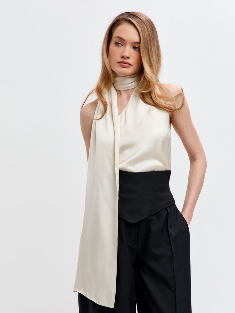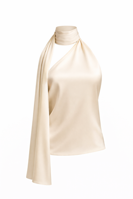 Изящный топ-халтер с шарфом в черном оттенке — воплощение элегантности и утончённости. Асимметричный крой с открытыми плечами придаёт образу лёгкую дерзость, а струящийся шарф вокруг шеи добавляет нотку аристократичной грации. Выполнен из шелковистого материала, который приятно облегает тело, создавая ощущение невесомости. Идеальный выбор для вечернего выхода или стильного дневного образа — сочетает в себе роскошь и лаконичность.