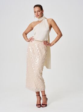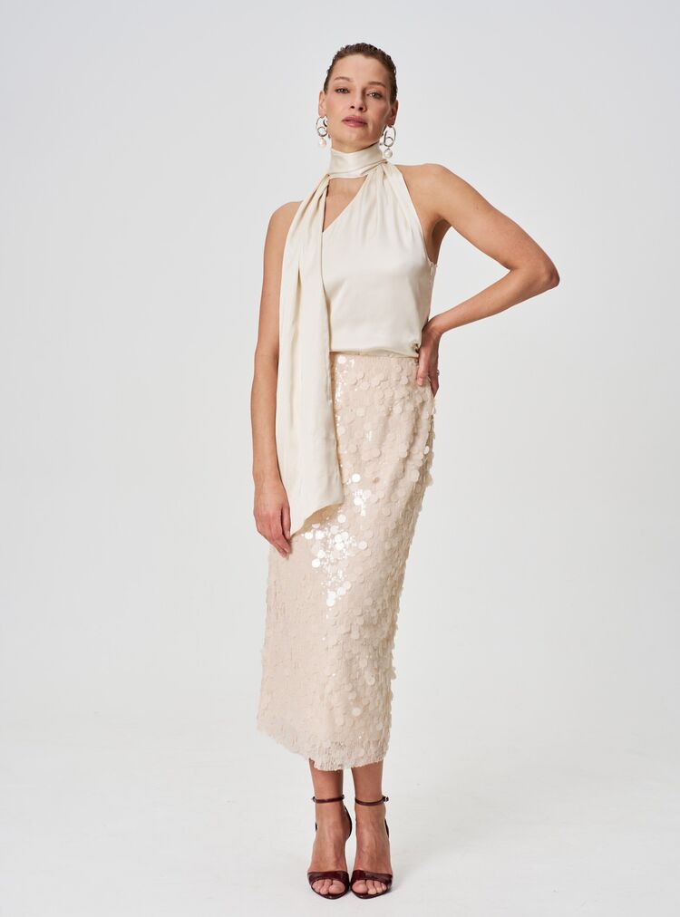 Изящный топ-халтер с шарфом в черном оттенке — воплощение элегантности и утончённости. Асимметричный крой с открытыми плечами придаёт образу лёгкую дерзость, а струящийся шарф вокруг шеи добавляет нотку аристократичной грации. Выполнен из шелковистого материала, который приятно облегает тело, создавая ощущение невесомости. Идеальный выбор для вечернего выхода или стильного дневного образа — сочетает в себе роскошь и лаконичность.