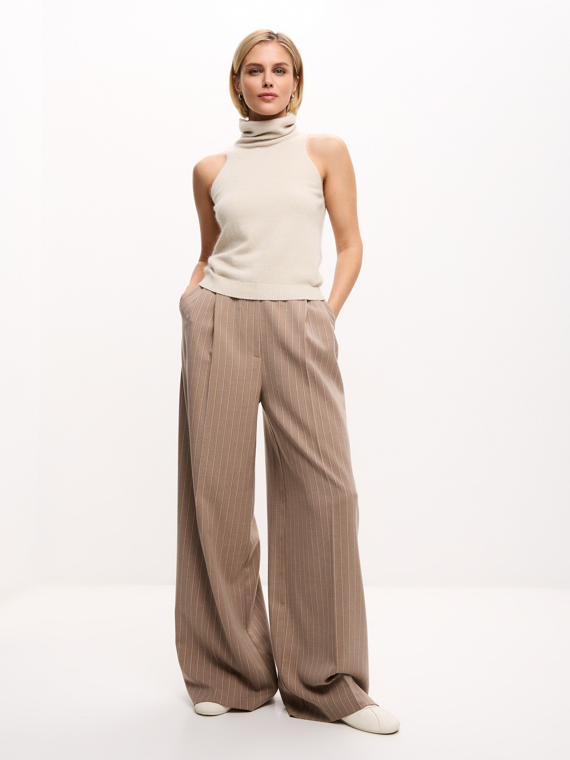 Базовый топ в светло-бежевом цвете с высокой горловиной. Плотный, но мягкий материал дарит комфорт в носке. Отлично подойдёт как самостоятельный элемент или в сочетании с жакетом, создавая элегантный многослойный образ.