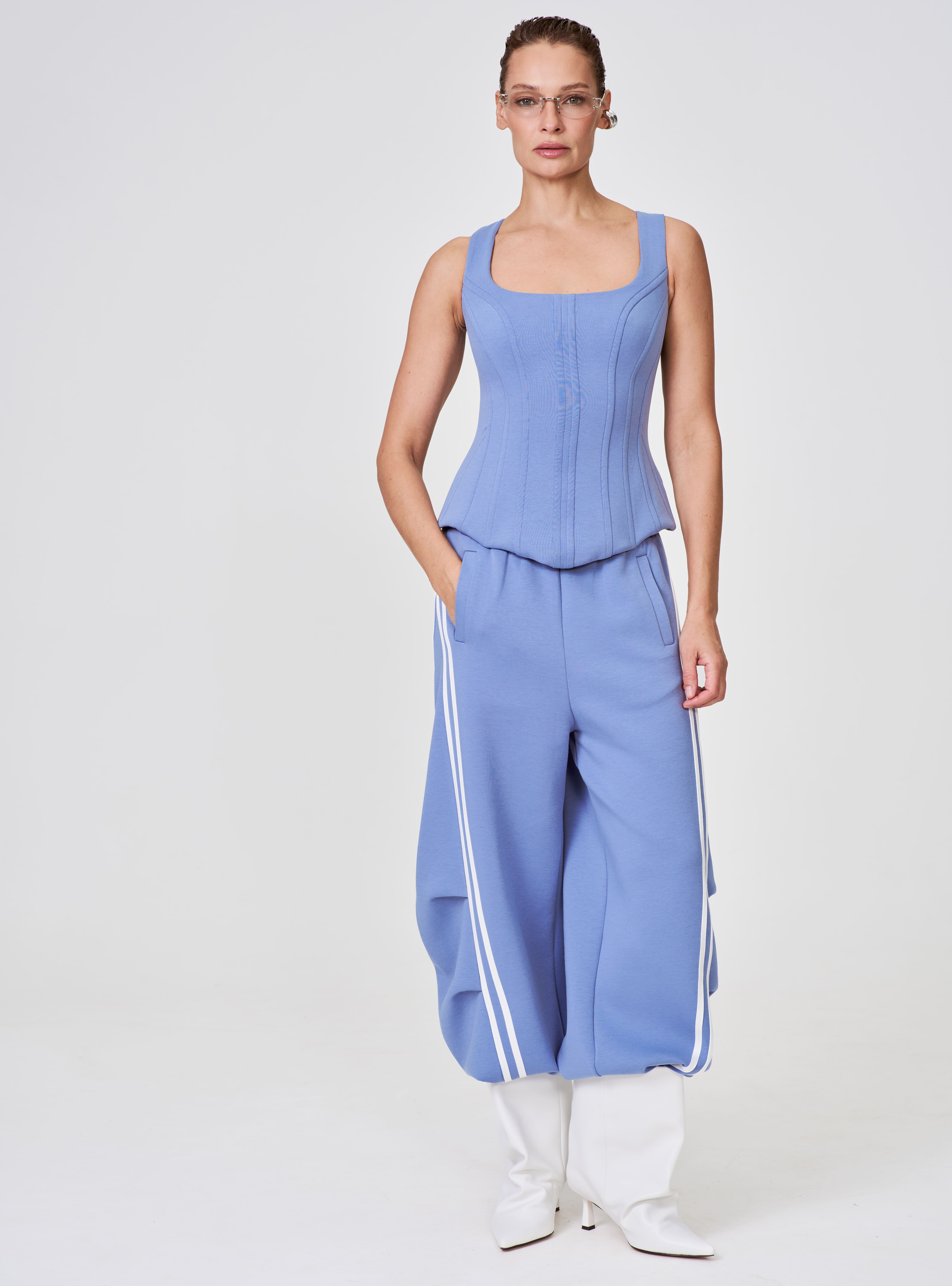 Корсет из скубы — стильное решение для создания женственного образа. Элегантный синий оттенок и вертикальные вытачки визуально стройнят фигуру, подчёркивая талию и акцентируя внимание на силуэте. Модель без рукавов с глубоким квадратным вырезом выглядит одновременно сдержанно и изысканно, а застёжка на спинке — молния — обеспечивает удобство надевания и надёжную фиксацию. Корсет оснащён корсетными костями: они создают лёгкий утягивающий эффект и помогают изделию безупречно держать форму на протяжении всего дня. Эластичный материал обеспечивает комфортную посадку и свободу движений, не сковывая фигуру.