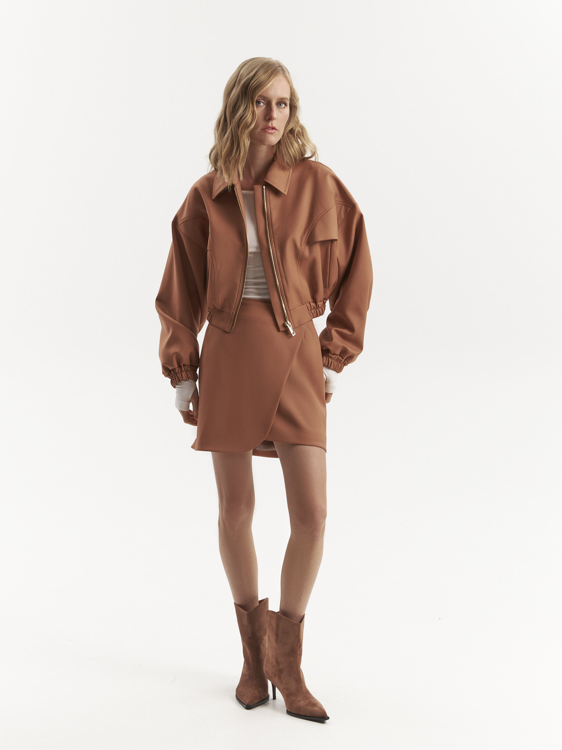 Бомбер в терракотовом цвете — стильная и практичная модель с резинками на манжетах и талии, которые обеспечивают комфортную посадку. Золотая фурнитура добавляет изысканности, делая его идеальным выбором для стильных повседневных образов.