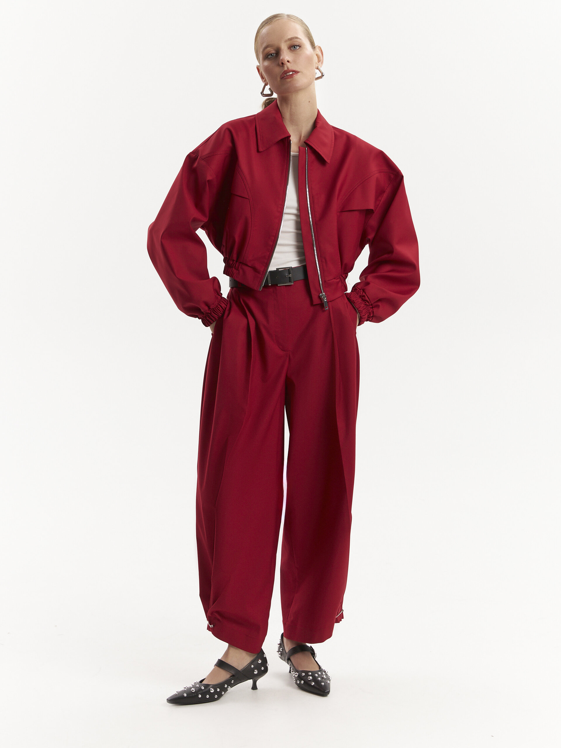 Бомбер в насыщенном бордовом оттенке – стильное дополнение к любому образу. Комфортная посадка, мягкие резинки на манжетах и талии создают идеальную посадку, а универсальный фасон делает его актуальным как для повседневного гардероба, так и для эффектных стильных сочетаний.