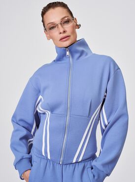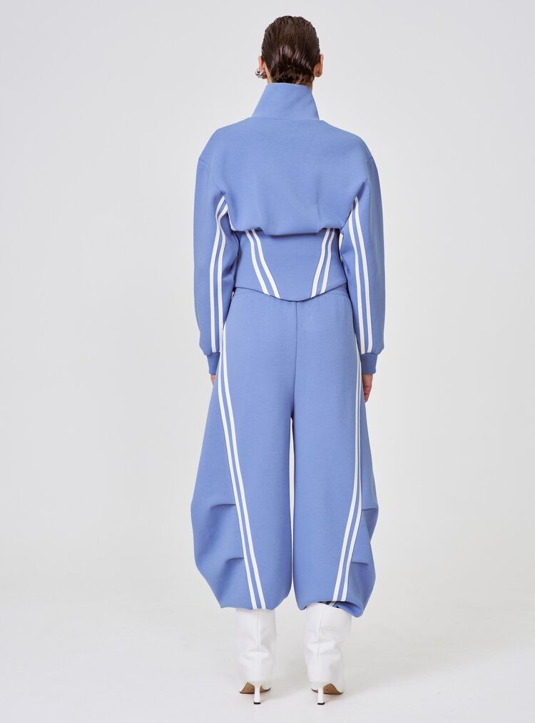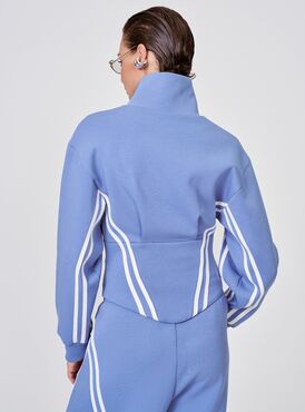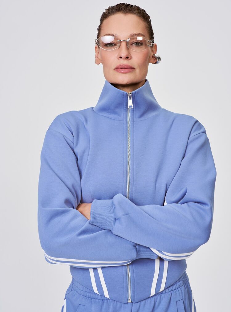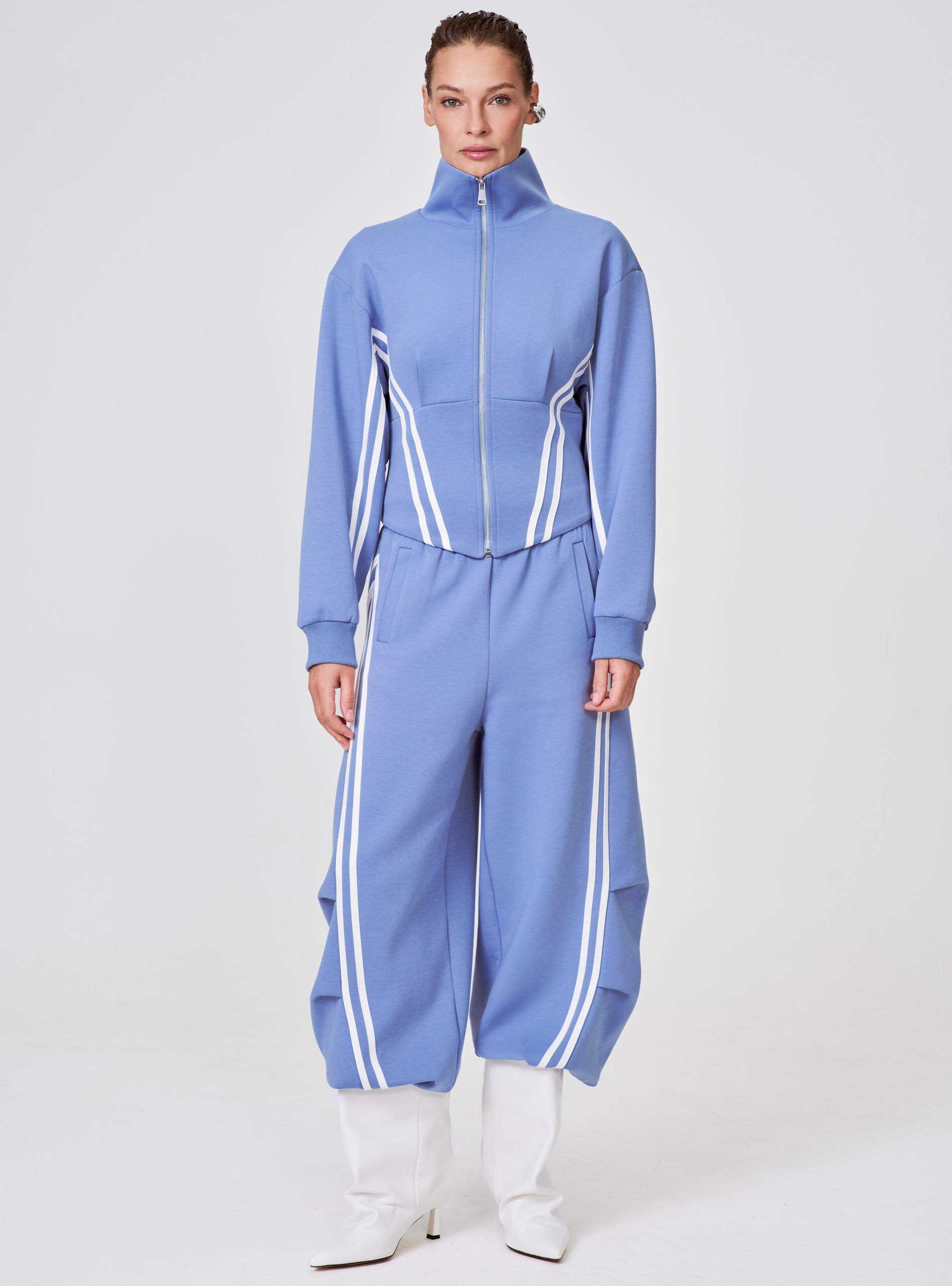 Укороченная олимпийка с лампасами — стильный микс спорта и моды в вашем гардеробе. Синий цвет с выразительными молочными лампасами создают динамичный образ, а укороченный крой подчёркивает талию, добавляя женственности. Удобная застёжка-молния позволяет легко надевать и снимать изделие, а эластичные манжеты надёжно фиксируют рукава. Практичная и комфортная модель идеально подойдёт как для активного отдыха, так и для повседневных луков.