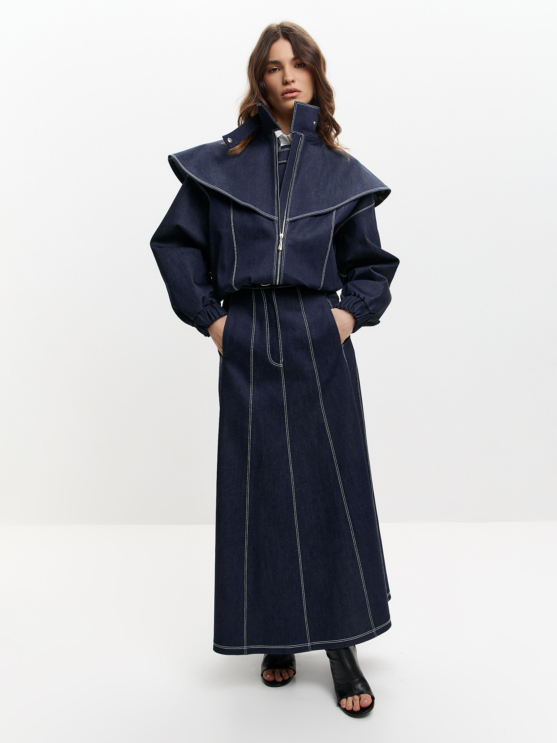 Стильная джинсовая куртка с оригинальным дизайном — акцентная деталь для современного гардероба. Модель выполнена из плотного тёмно-синего денима с контрастной белой прострочкой, которая подчёркивает геометрию кроя. Главная особенность — объёмный структурированный воротник, придающий образу футуристичность и выразительность. Куртка застёгивается на молнию, имеет высокий стоячий воротник и лаконичные манжеты на резинке, которые обеспечивают комфортную посадку по рукам. Свободный крой не сковывает движения, а удлинённые рукава добавляют практичности.