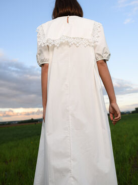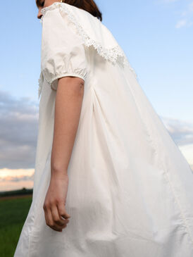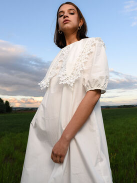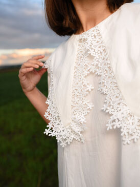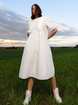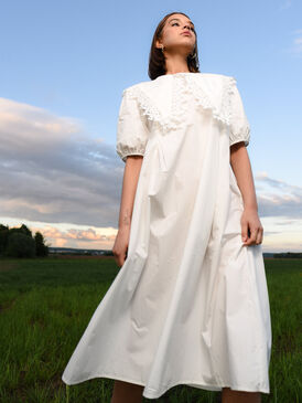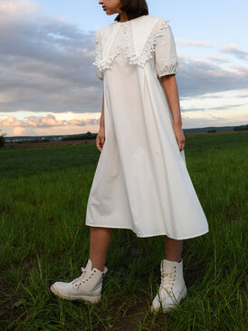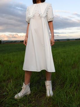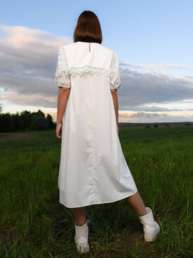 Легкое милое платье сшито из стопроцентного мягкого хлопка. Простой комфортный крой сочетается с дизайнерскими деталями - трендовым большим воротником и кружевными вставками. Благодаря этому платье одновременно романтичное и комфортное. Платье базового теплого молочного оттенка, что позволяет сочетать с ним обувь и аксессуары любых цветов.