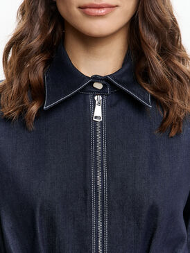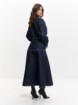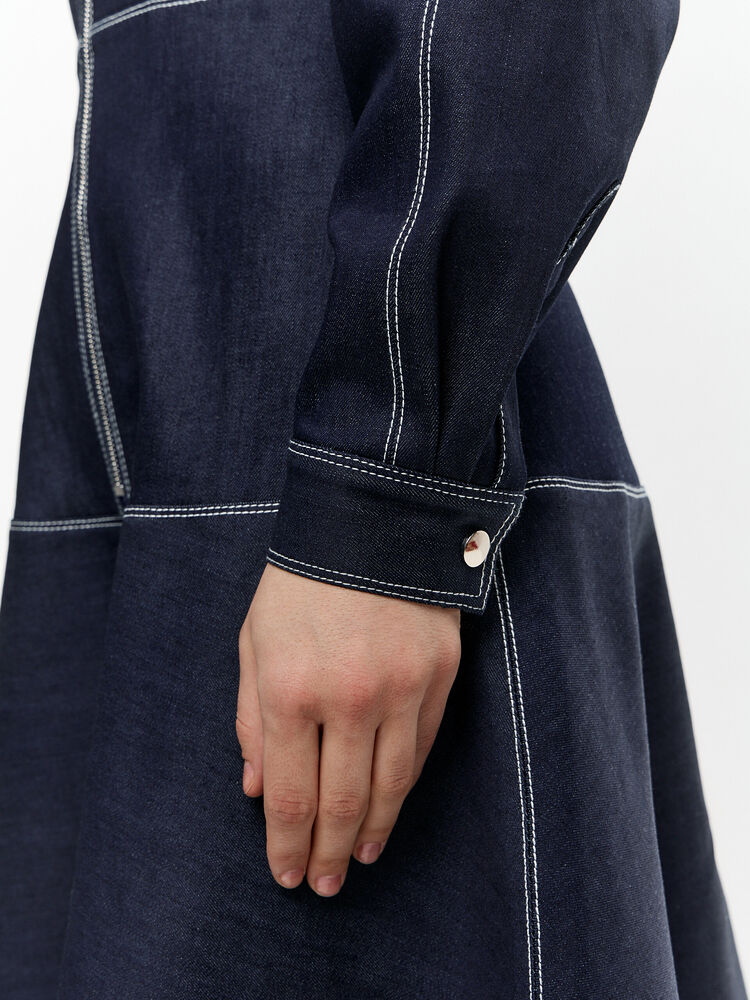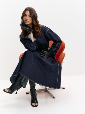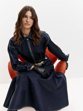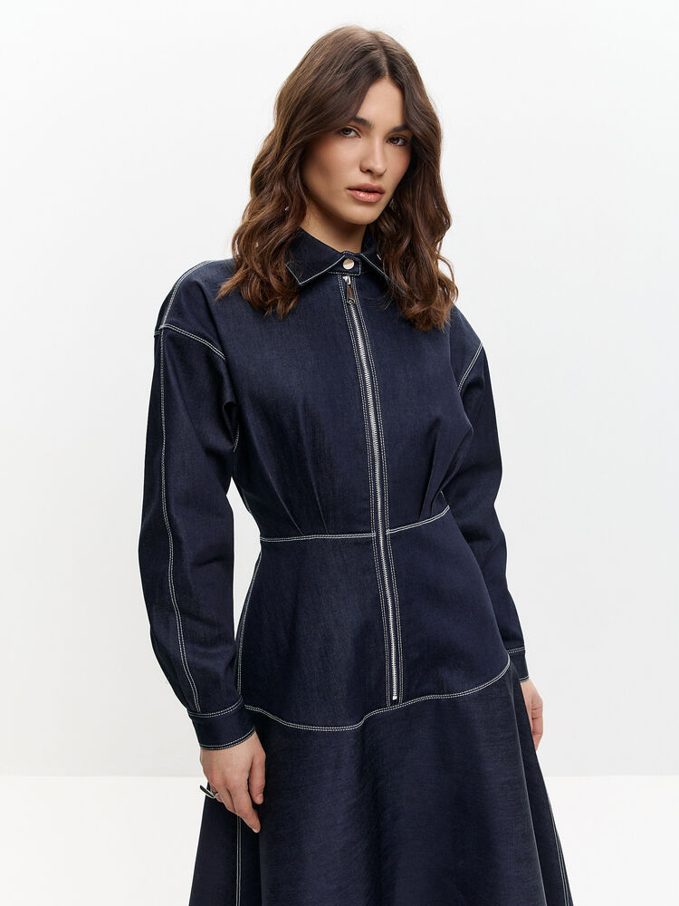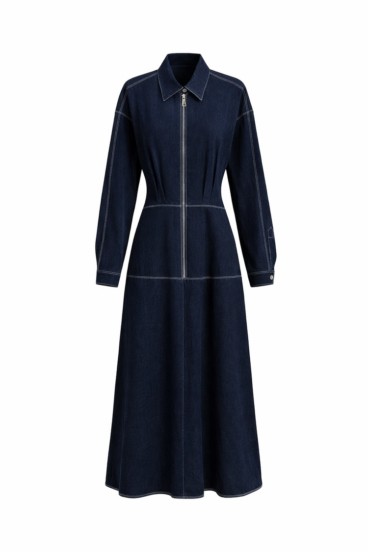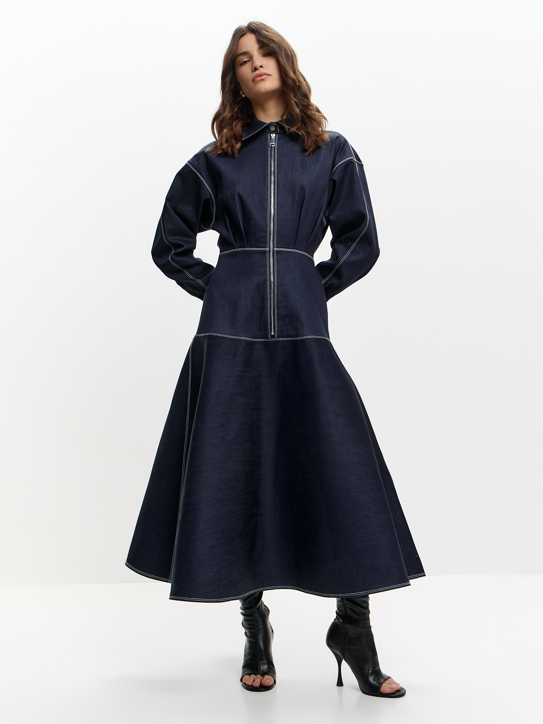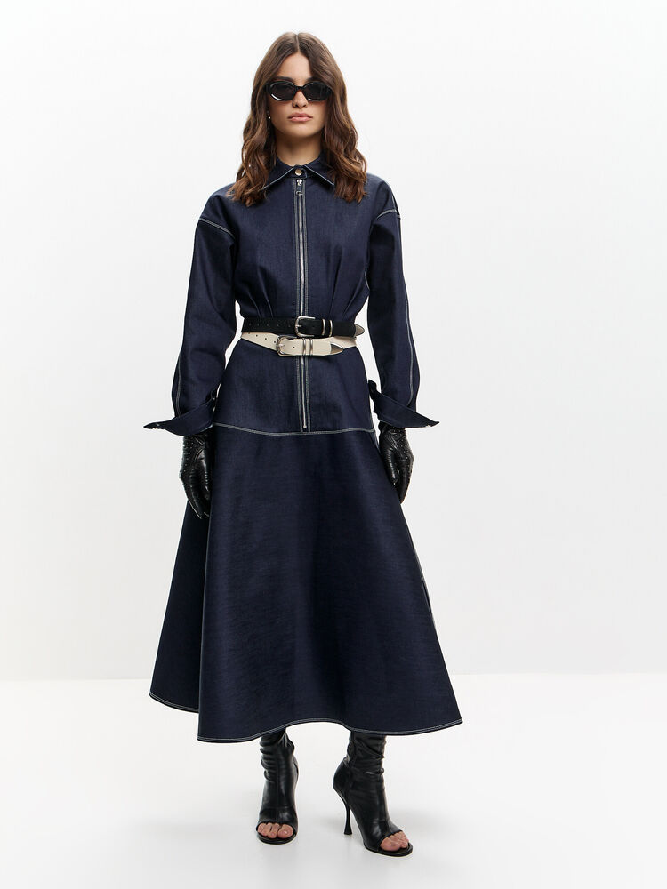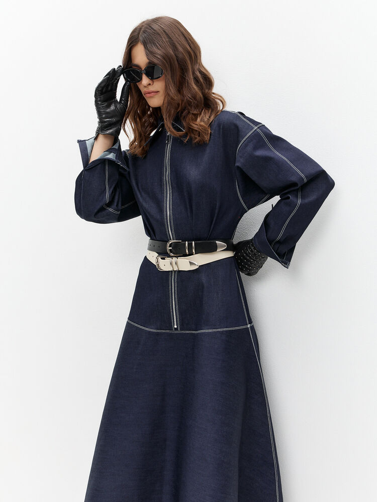 Темно-синее платье макси с акцентным кроем — та самая модель, которая сразу собирает образ. Приталенный силуэт подчёркивает талию, а расклёшенная юбка красиво движется при ходьбе, создавая эффект лёгкости. Вертикальная молния визуально вытягивает фигуру и добавляет современный характер.