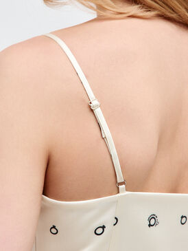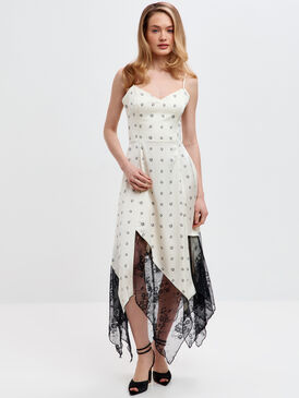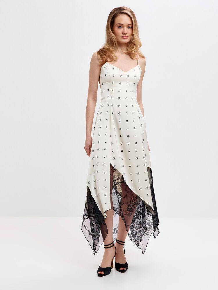 Особенность платья — контрастные вставки из чёрного кружева, которые добавляют образу утончённости и лёгкой игривости. Асимметричный крой подола с клиньями делает модель оригинальной и динамичной: длина варьируется, подчёркивая линию ног, а сами клинья придают платью объём и лёгкую динамику, делая силуэт более выразительным.