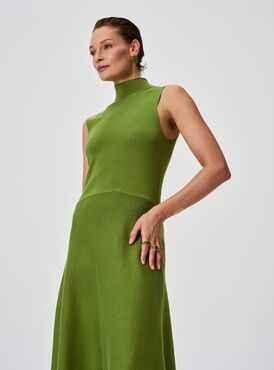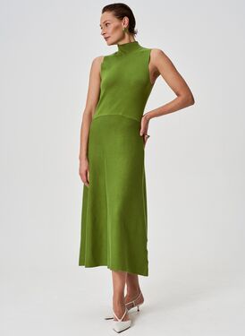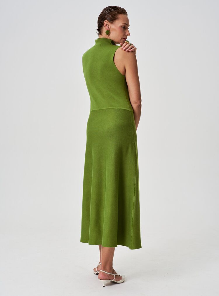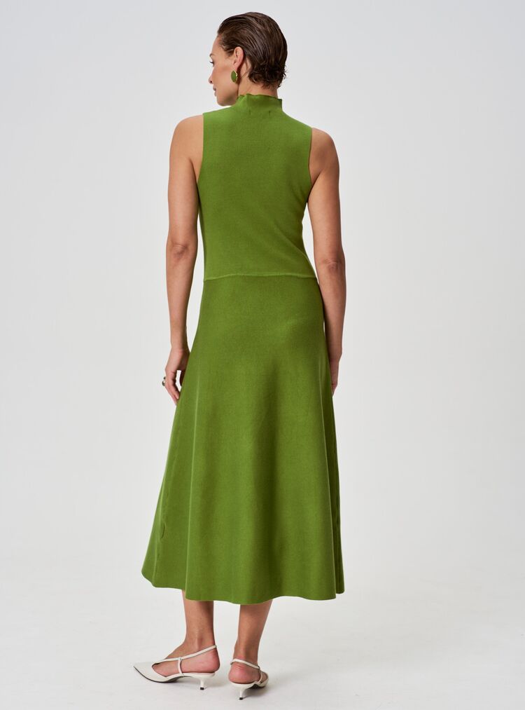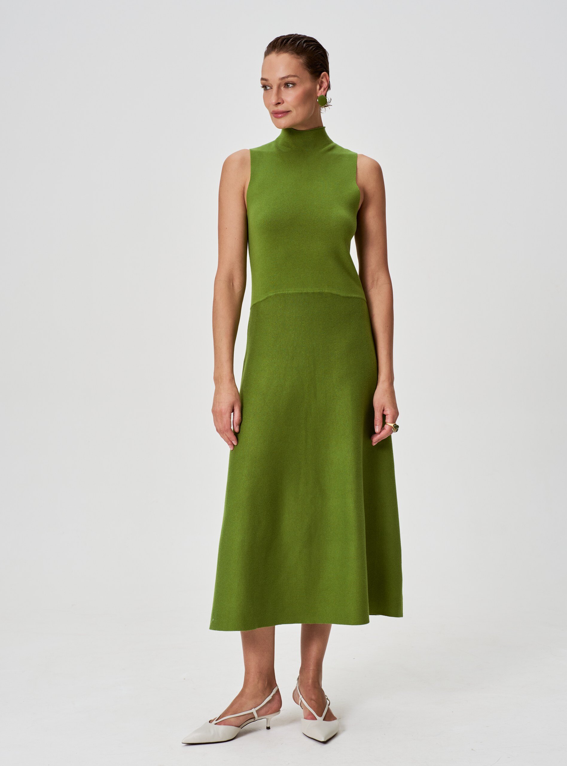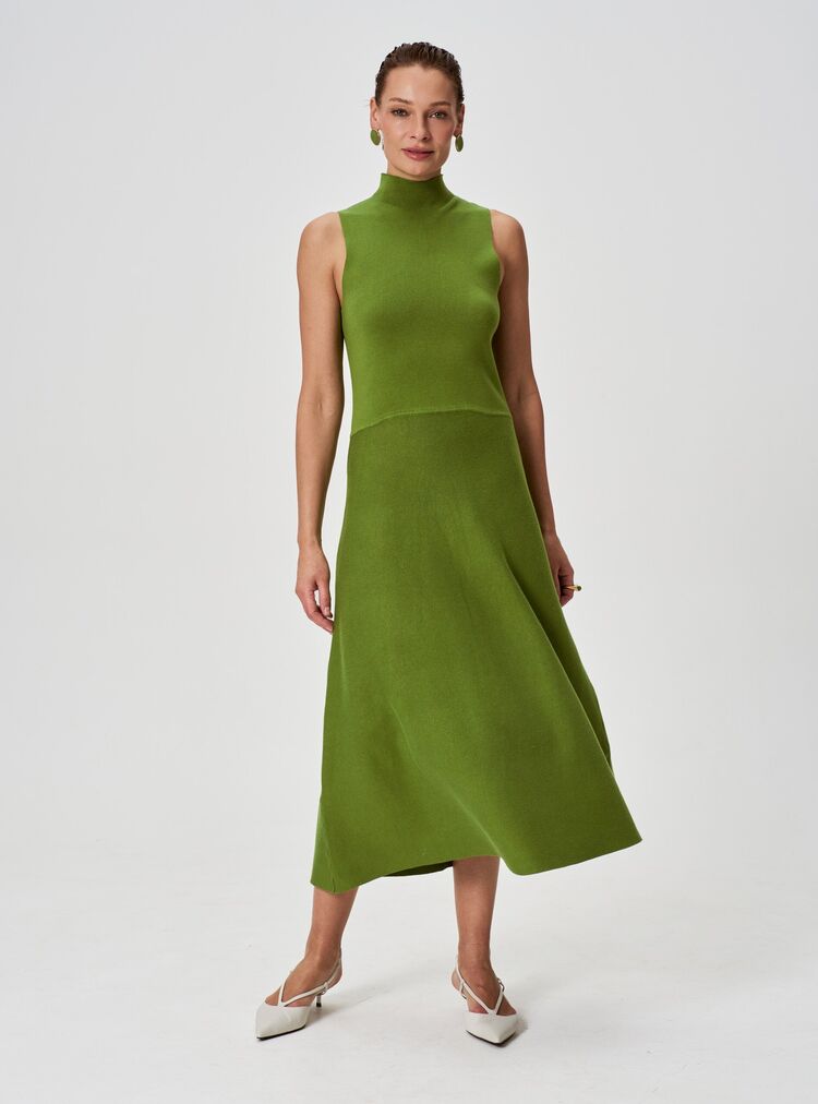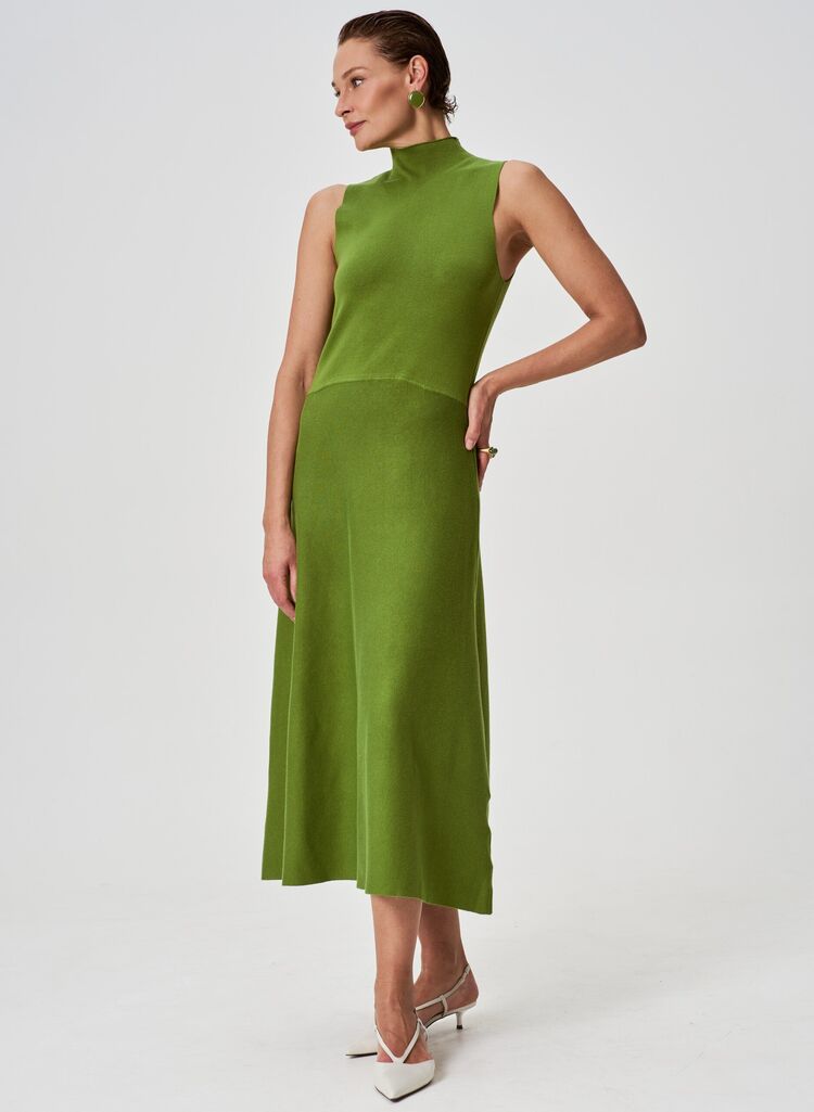 Элегантное трикотажное платье насыщенного зелёного оттенка — воплощение простоты и стиля. Модель без рукавов с высоким воротом подчёркивает линию шеи и создаёт лаконичный, но выразительный образ. Свободный крой и расклёшенная юбка обеспечивают комфорт и лёгкость движений, а мягкая ткань приятно облегает фигуру. Универсальный фасон подойдёт как для повседневных прогулок, так и для неформальных встреч. Яркий цвет добавит свежести в любой гардероб, а практичная конструкция сделает это платье любимой вещью в вашем шкафу.