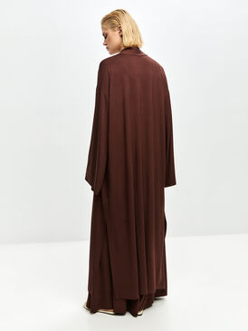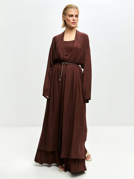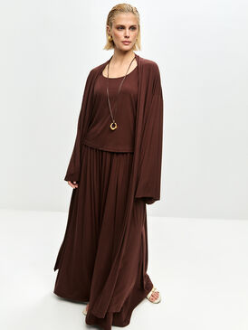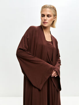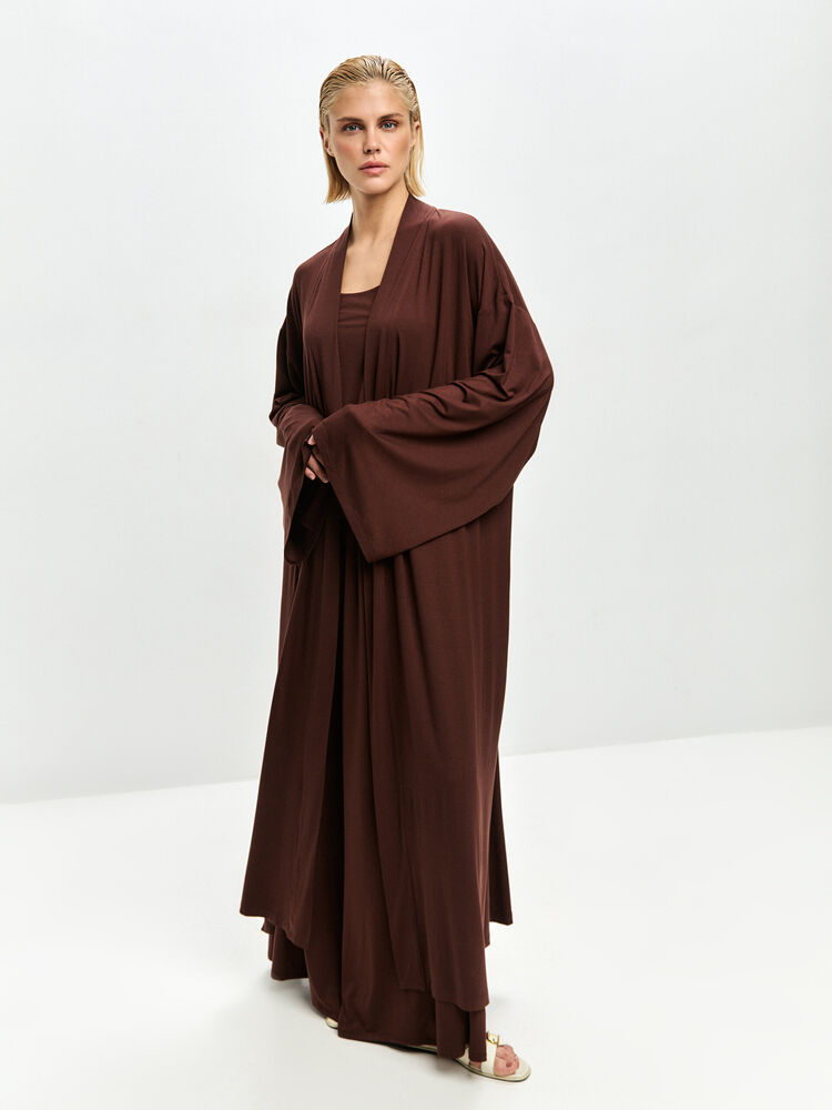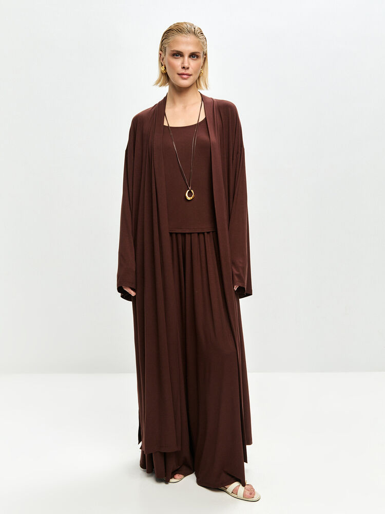Кардиган-кимоно в шоколадном цвете — лёгкий и струящийся вариант для летнего многослойного гардероба. Выполнен из тонкой полупрозрачной ткани, свободного силуэта, с широкими рукавами. Модель не имеет застёжек и прекрасно драпируется на фигуре, создавая ощущение лёгкости и комфорта. Глубокий шоколадный оттенок добавляет образу элегантности. Идеален для отпускных образов, прогулок или как стильная альтернатива жакету.