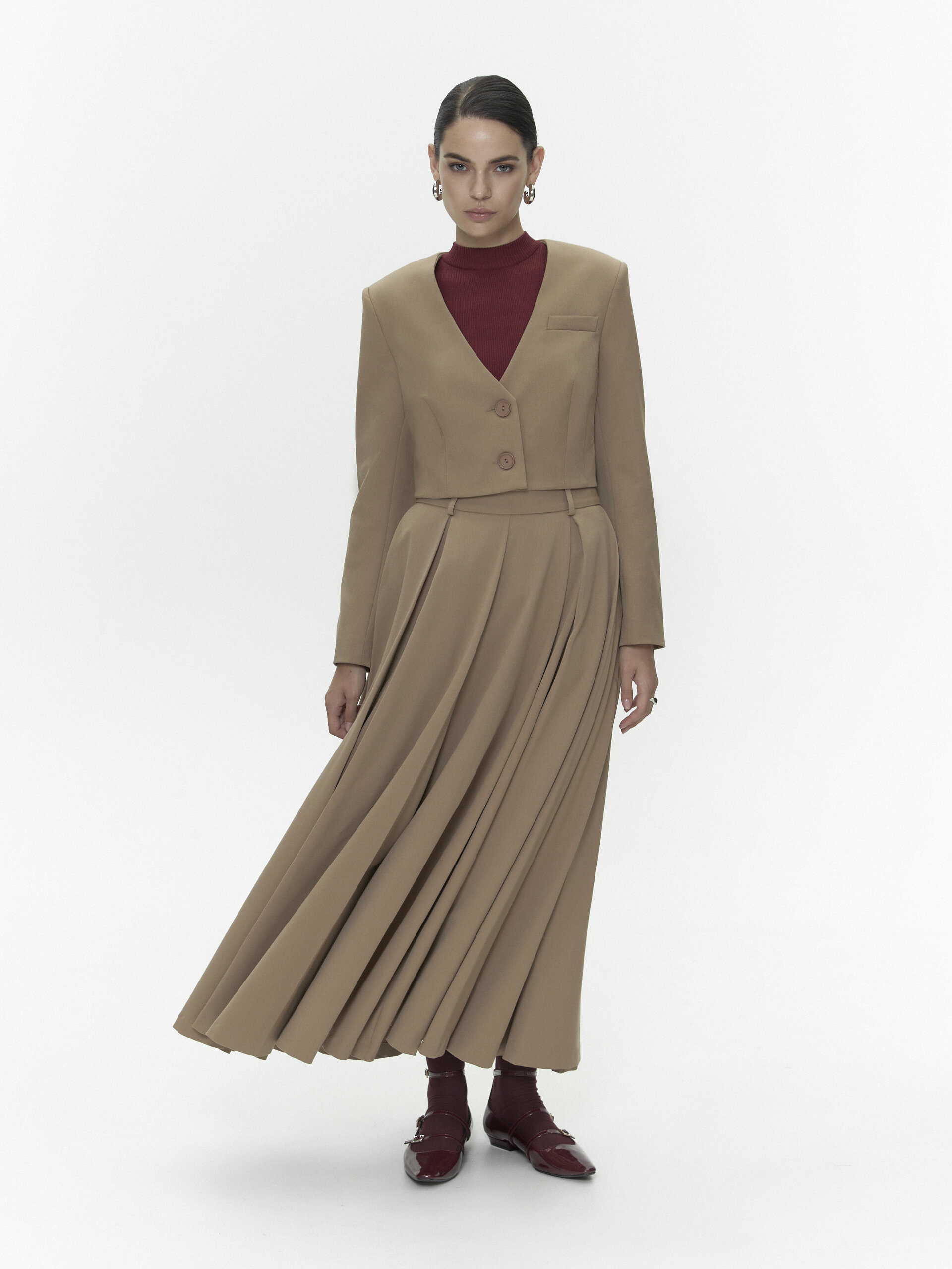 Укороченный жакет без воротника. Прямой крой. Выполнен из костюмной ткани с подкладом в цвет изделия. Есть пуговицы в тон, а также имитация кармана на груди. В комплекте есть галстук-шарф.
