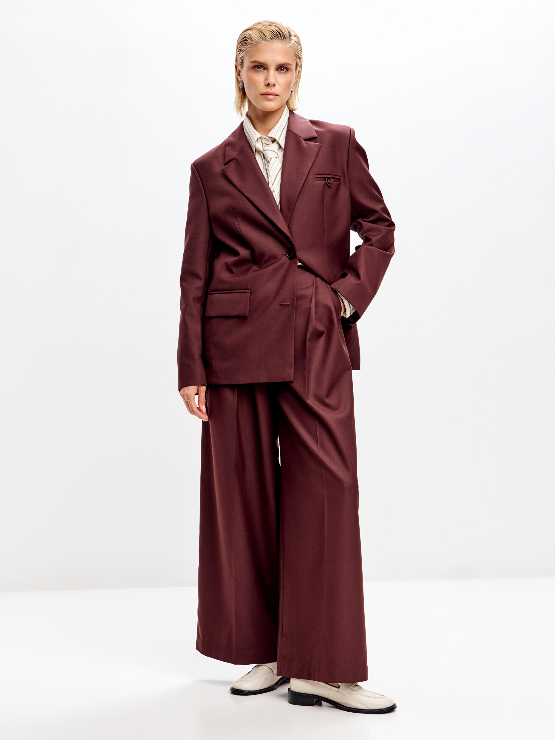 Жакет прямого кроя в насыщенном тёмно-шоколадном цвете. Лаконичный силуэт подчёркивает элегантность и создаёт основу для женственных образов. Нагрудный карман добавляет практичности, не утяжеляя дизайн. Модель легко вписывается как в деловой гардероб, так и в повседневные сочетания — с брюками, юбками или лёгкими платьями.
