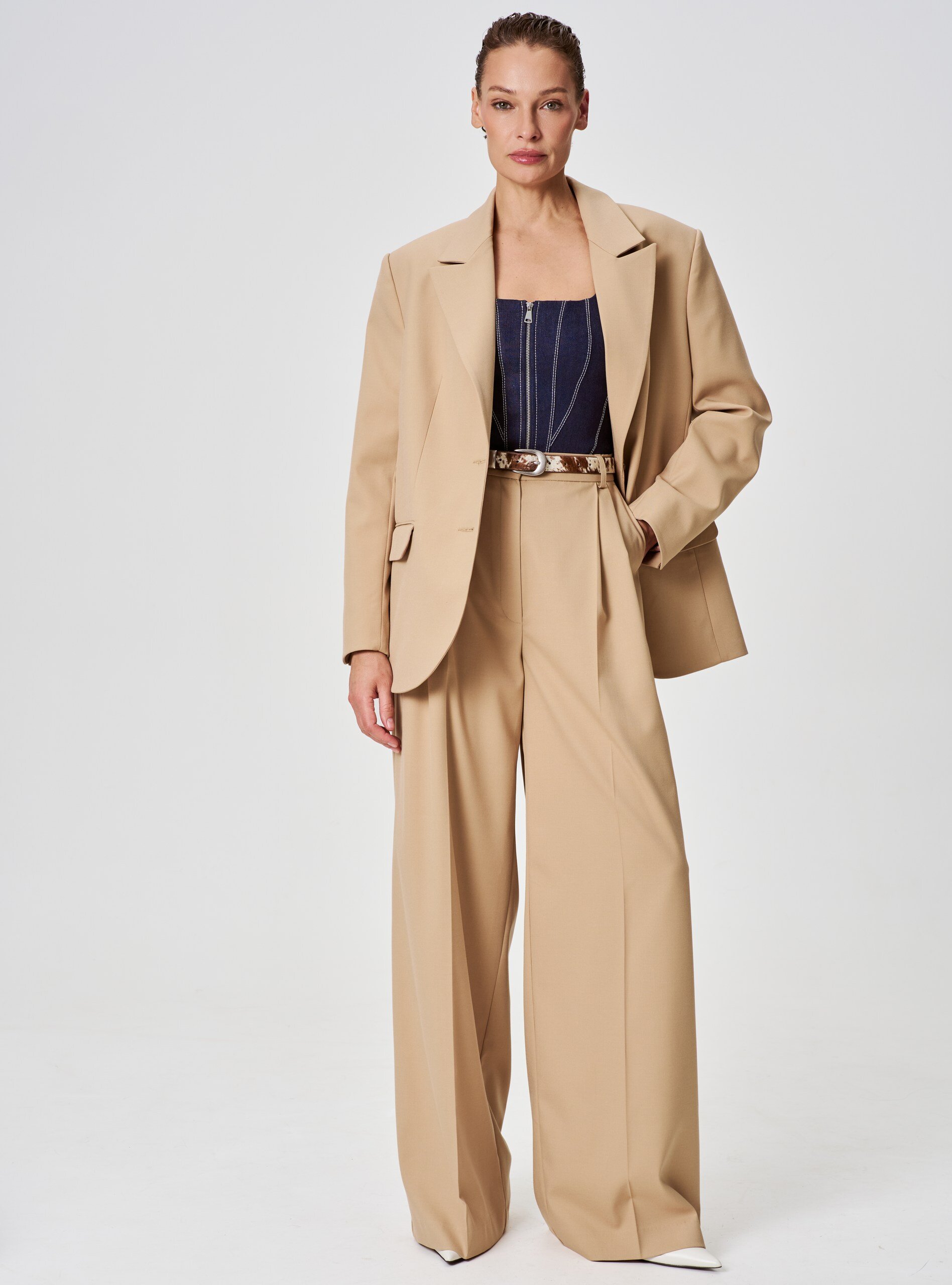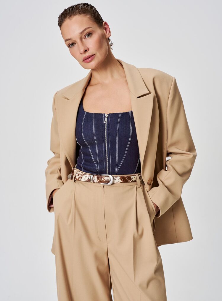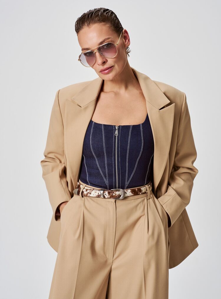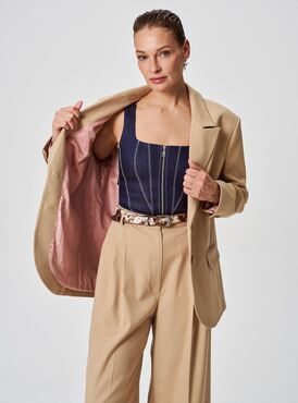 Бежевый жакет прямого кроя — базовая вещь для разнообразных образов. Лаконичный дизайн с чётким силуэтом подчёркивает линию плеч и не сковывает движений.