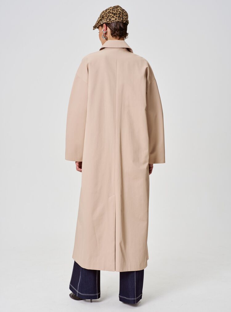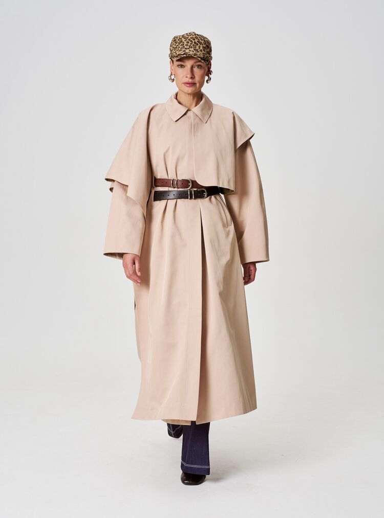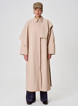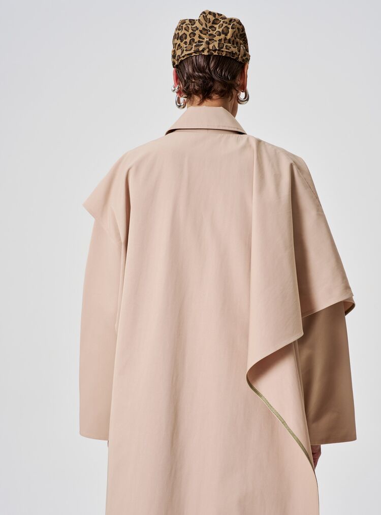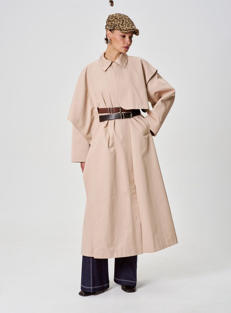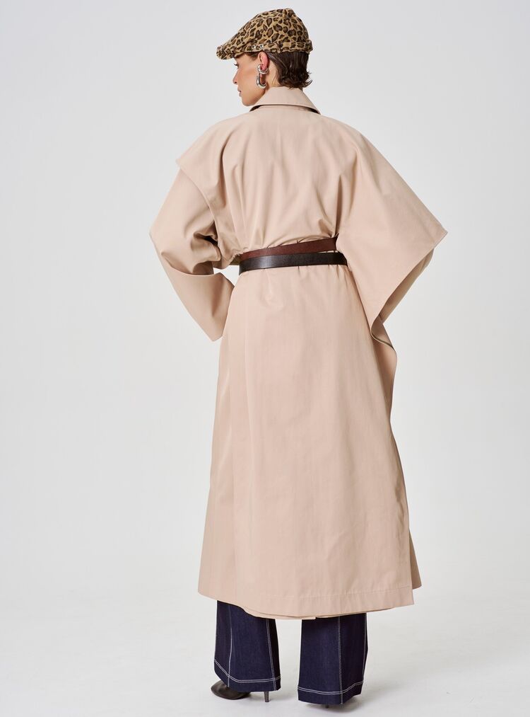Бежевый тренч с кейпом — стильное решение для тех, кто ценит элегантность и оригинальность. Благодаря асимметричному кейпу модель выглядит современно, при этом остаётся практичной для повседневной носки. Универсальный нейтральный оттенок легко сочетается с разными элементами гардероба — от классических брюк и юбок до кэжуал-образов. Свободный крой не сковывает движения, а продуманный дизайн добавляет нотку утончённости.
