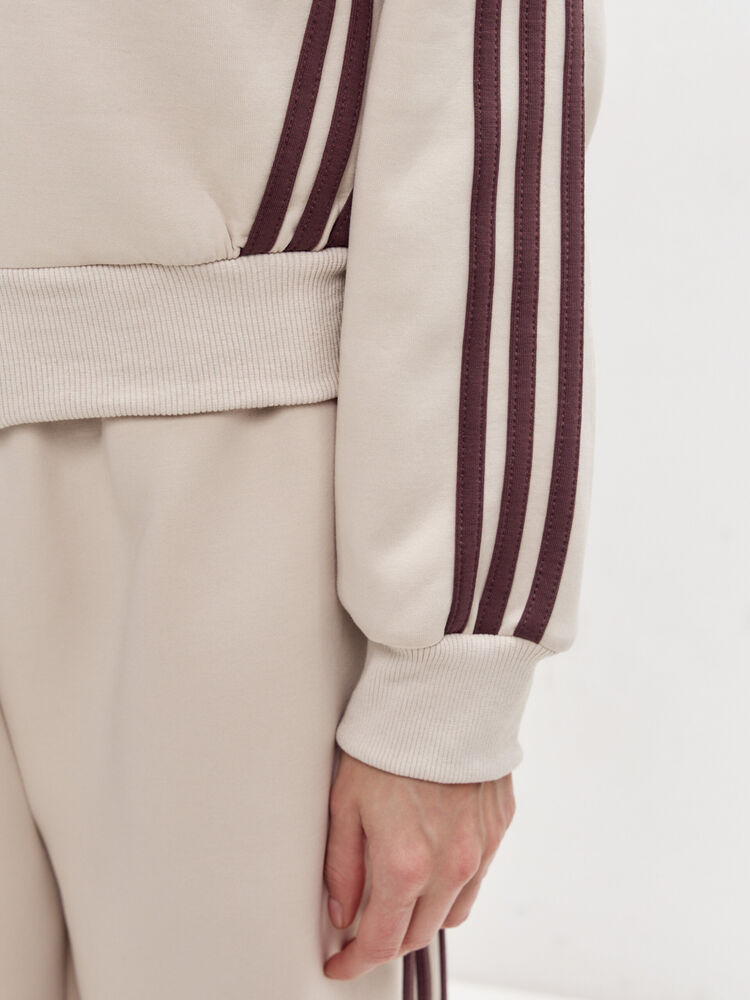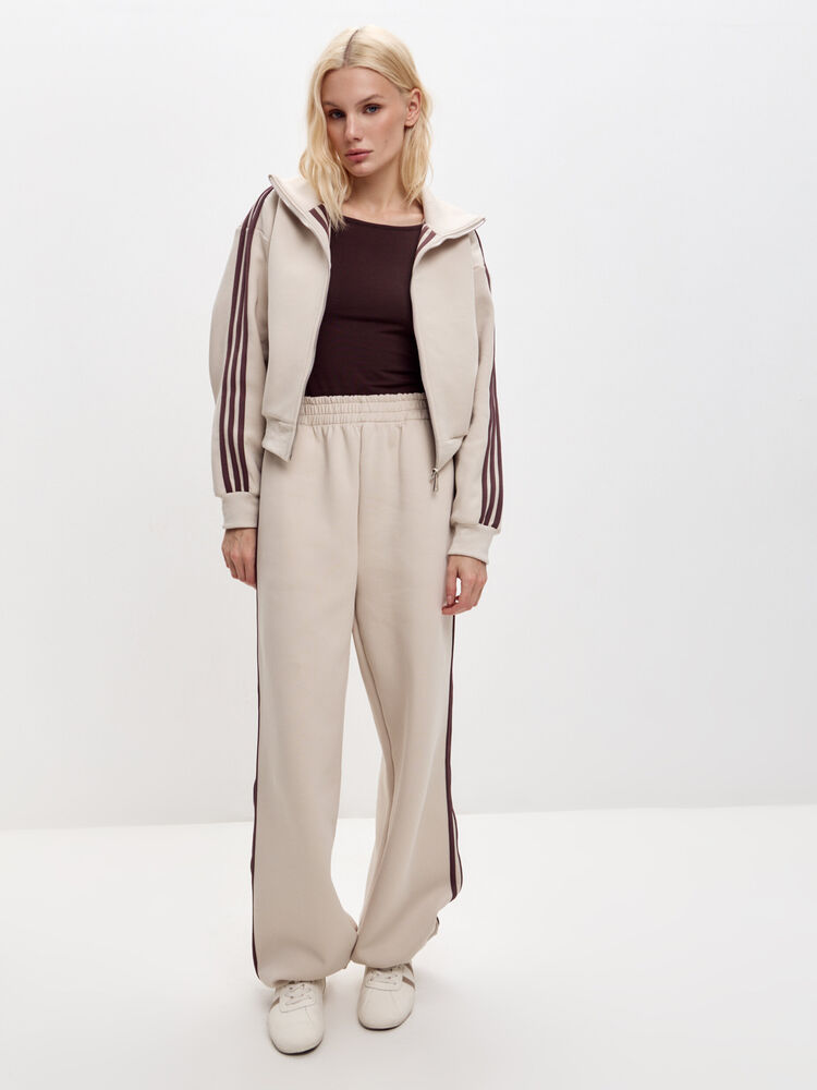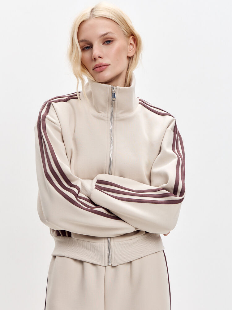 Куртка светло-бежевого цвета. Оверсайз силуэт, спущенный рукав. Длина короткая, есть резинка внизу, молний, заклёпки, два кармана. Воротник с отстёгивающимся мехом. Ткань плотная, фактура гладкая.